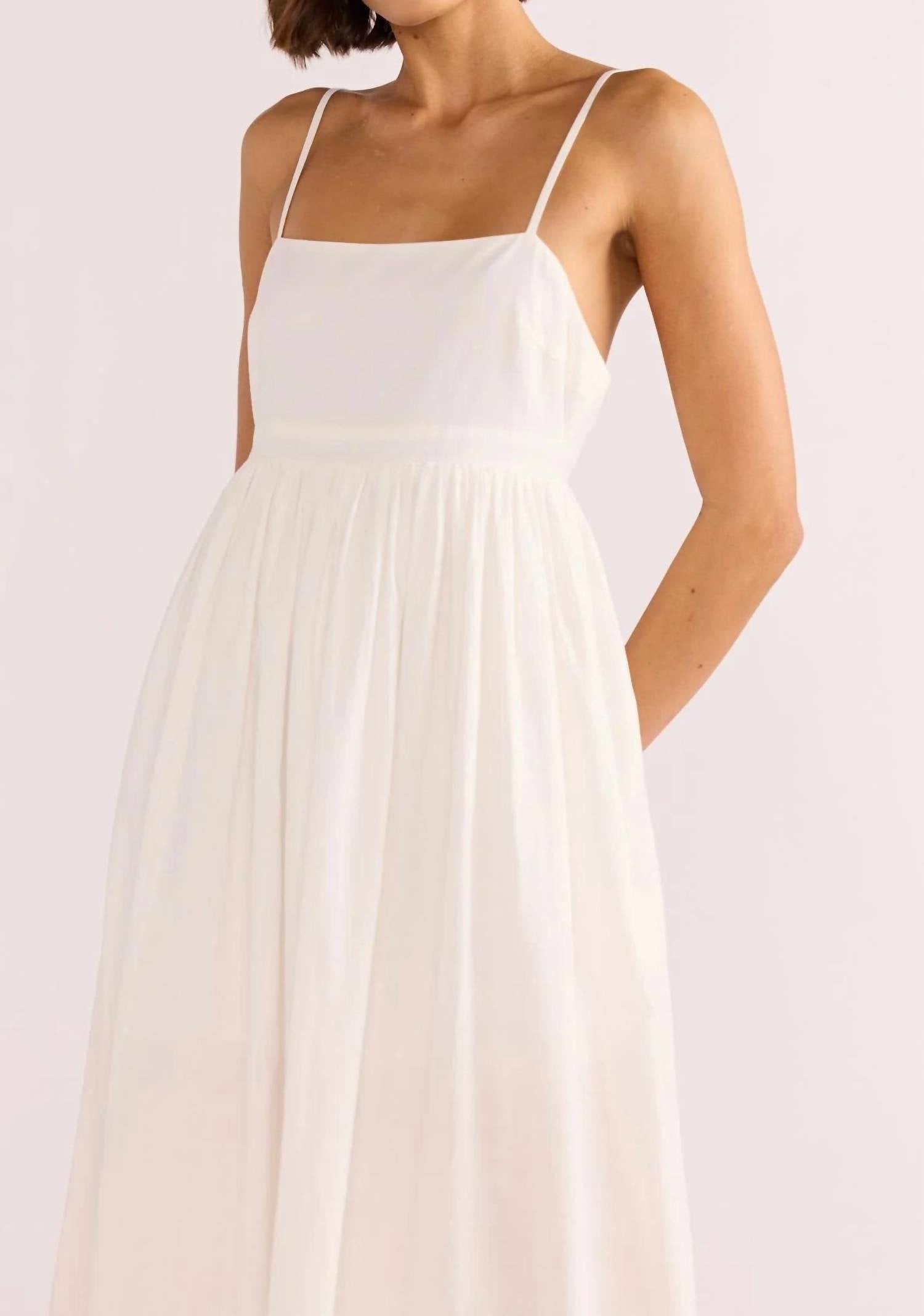 Just add slides or mules and you are good to go. Embrace effortless vacation style with the Isadora Embroidered Midi Dress by MINKPINK, designed for those sunlit beach-to-bar transitions. This women’s dress features delicate spaghetti straps and a chic square neckline, embellished with a graphic embroidered palm print design on the hem. Made from 65% Cotton, 30% Viscose, 5% Linen material, the dress offers a comfortable babydoll silhouette and an open back, making it a summer essential. Closure: Pull-on. Care: Machine wash with line dry recommended. Ideal for evening events and streetwear-inspired ensembles.