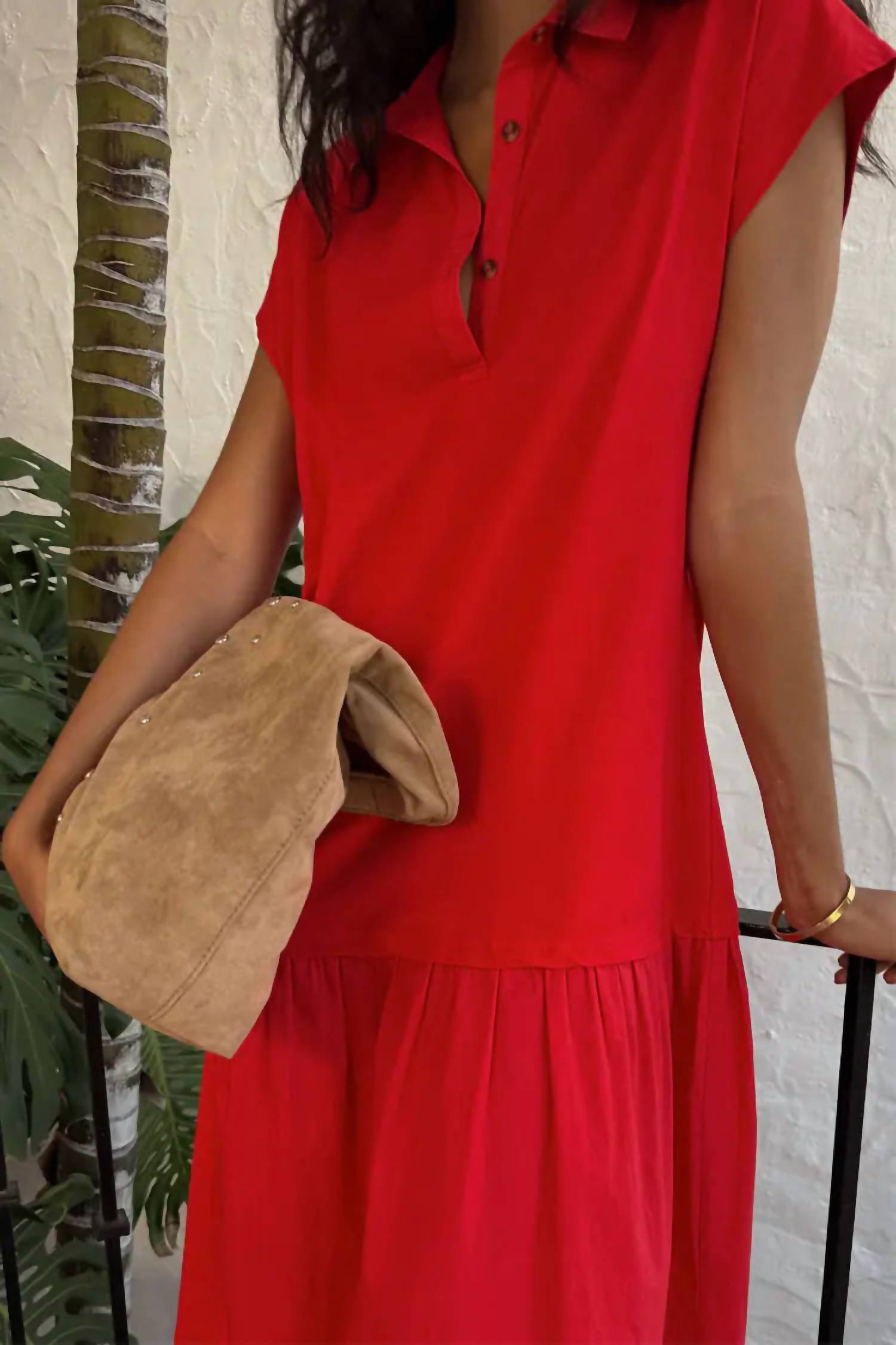 The perfect length dress does exist. Discover the Darcy Polo Dress by Never Fully Dressed, an excellent blend of style and comfort in trending red. With cap sleeves and a breathable 100% cotton construction, it ensures coolness in warm weather. The midi-length dress features a dropped waist and collared neckline, giving it a chic yet casual vibe. Closure: Button closure. Care: Machine wash and lay flat to dry. Perfect for summer occasions or a relaxed dinner party.