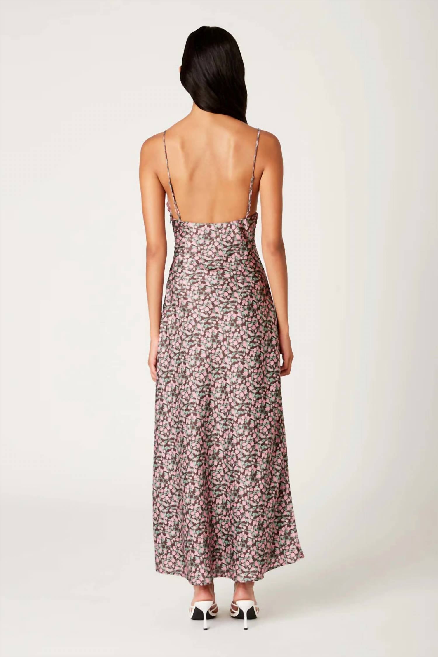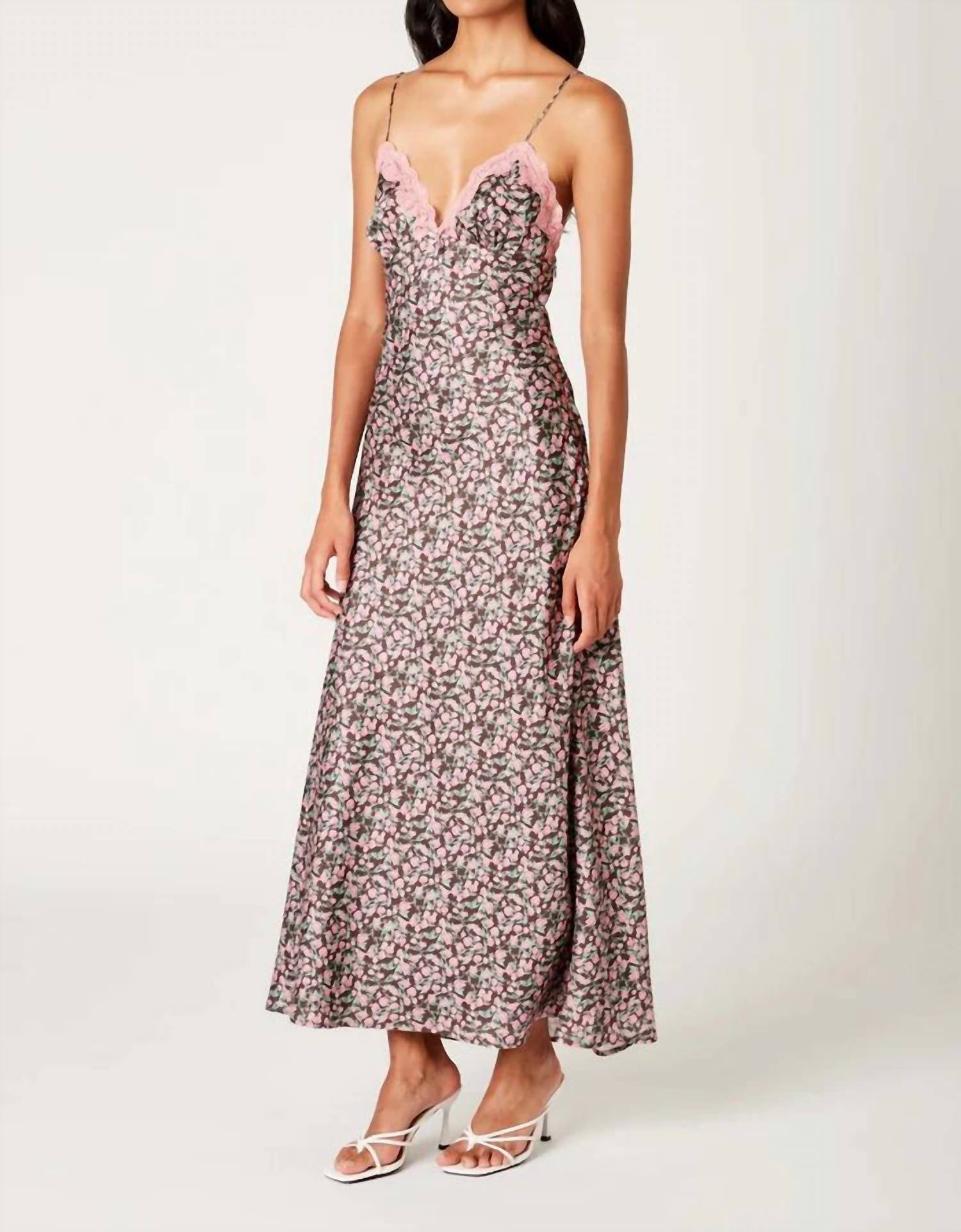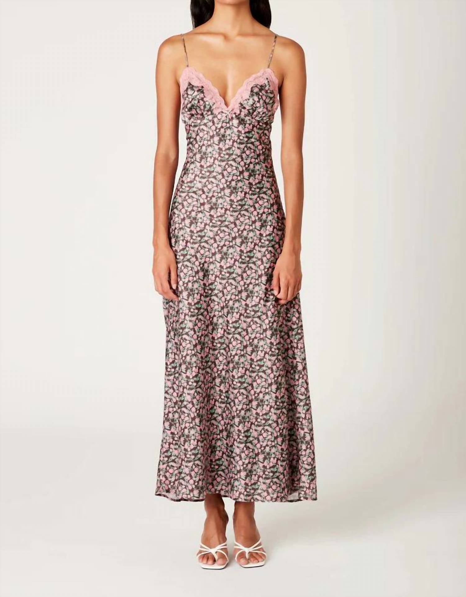 The perfect length dress does exist. Introducing the Jasmine Midi Dress by NIA, a vintage-inspired piece that captures timeless elegance with its bias-cut silhouette. This sleeveless dress, featuring adjustable spaghetti straps, is crafted from 100% polyester with a 95% polyester and 5% spandex lining for comfortable wear. Adorned with a soft V-neckline trimmed in lace, it showcases delicate floral prints on a rich brown base, complemented by a subtly flared hem for graceful movement. Closure: Pull-on. Care: Machine wash. Ideal for springtime affairs and special occasions, from anniversaries to Valentine's Day.