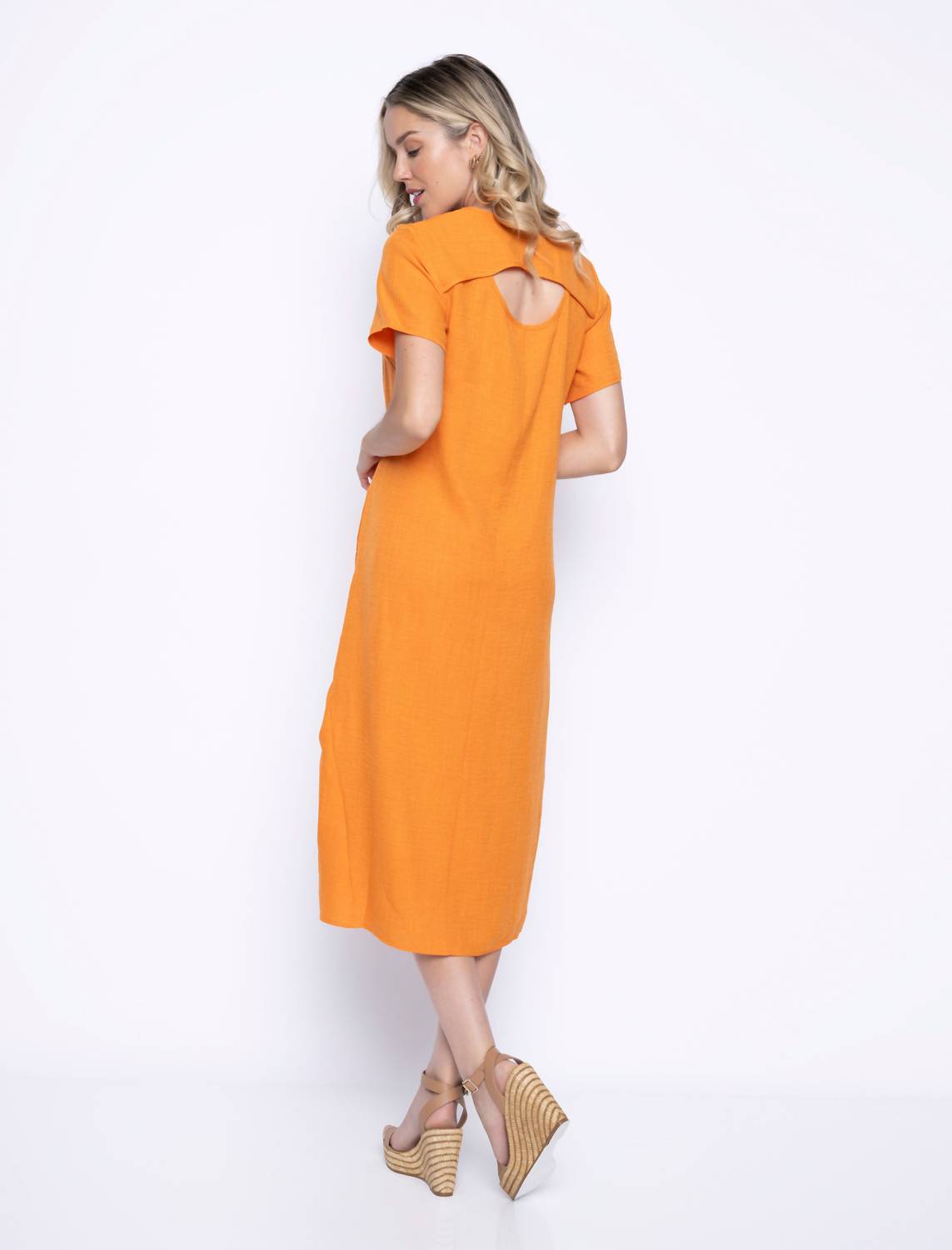 Just add slides or mules and you are good to go. Introducing the Maggy Hi-Lo Midi Dress by Picadilly, a playful and unique addition to your spring and summer wardrobe. This shift silhouette dress in vibrant orange features short sleeves, a scoop neckline, and convenient side pockets, along with a pleated design highlighted by front buttons and a back cutout. Crafted from 100% polyester in Canada, it combines style and ease with its machine washable material. Perfect for any occasion, this dress is a must-have for effortless seasonal dressing.