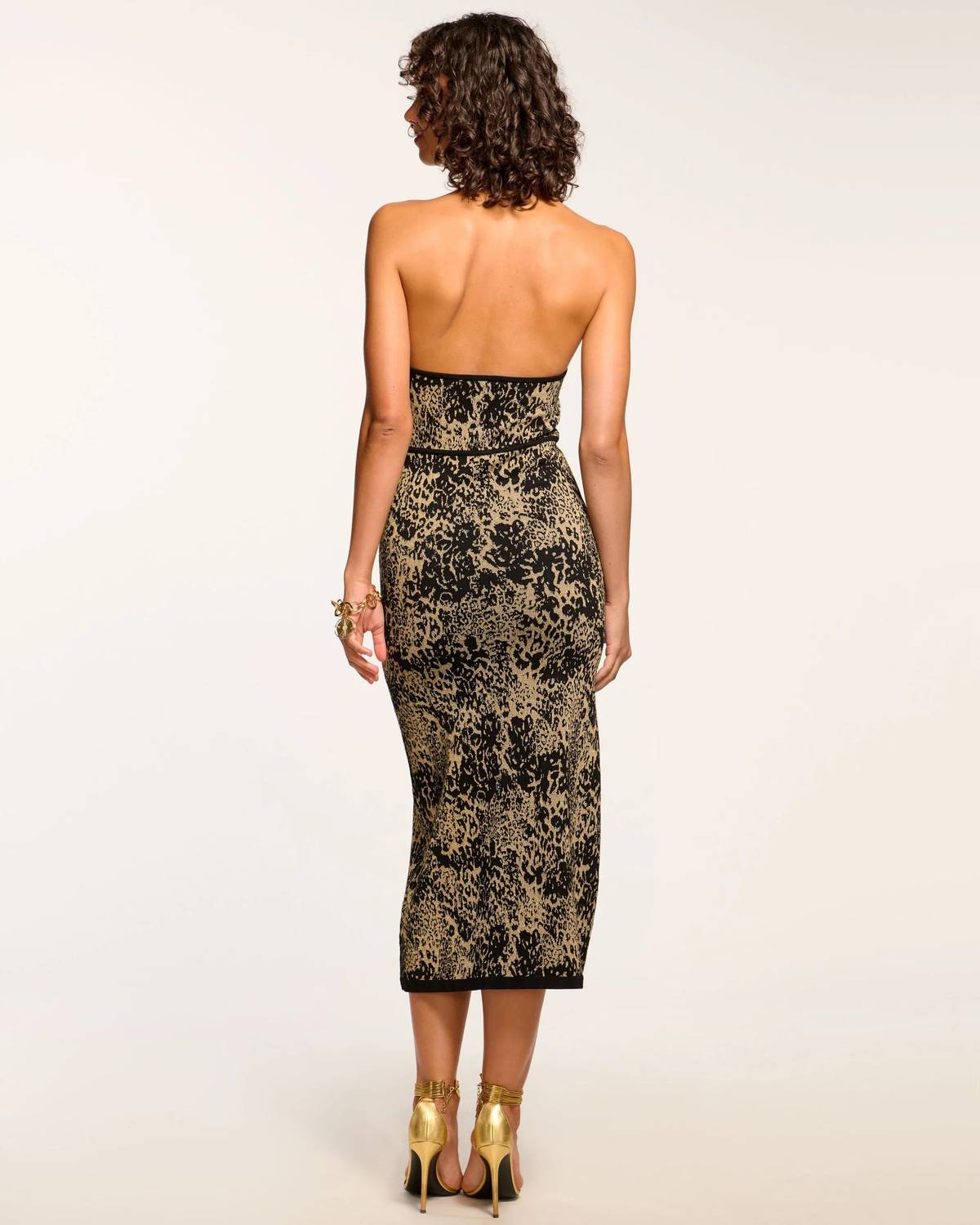 Just add slides or mules and you are good to go. Introducing the Candace Knit Halter Midi Dress by Ramy Brook, a captivating choice for evening events. This sleeveless dress in black and gold boasts a leopard jacquard fabric, offering a contemporary edge with its keyhole detail at the bust, and a bodycon silhouette for a chic look. Comprised of 63% Viscose, 30% Polyester, 5% Metallic, and 2% Spandex, it promises a comfortable fit with a stretchy knit. Care for your dress by dry cleaning or hand washing and laying flat to dry to maintain its elegant look.