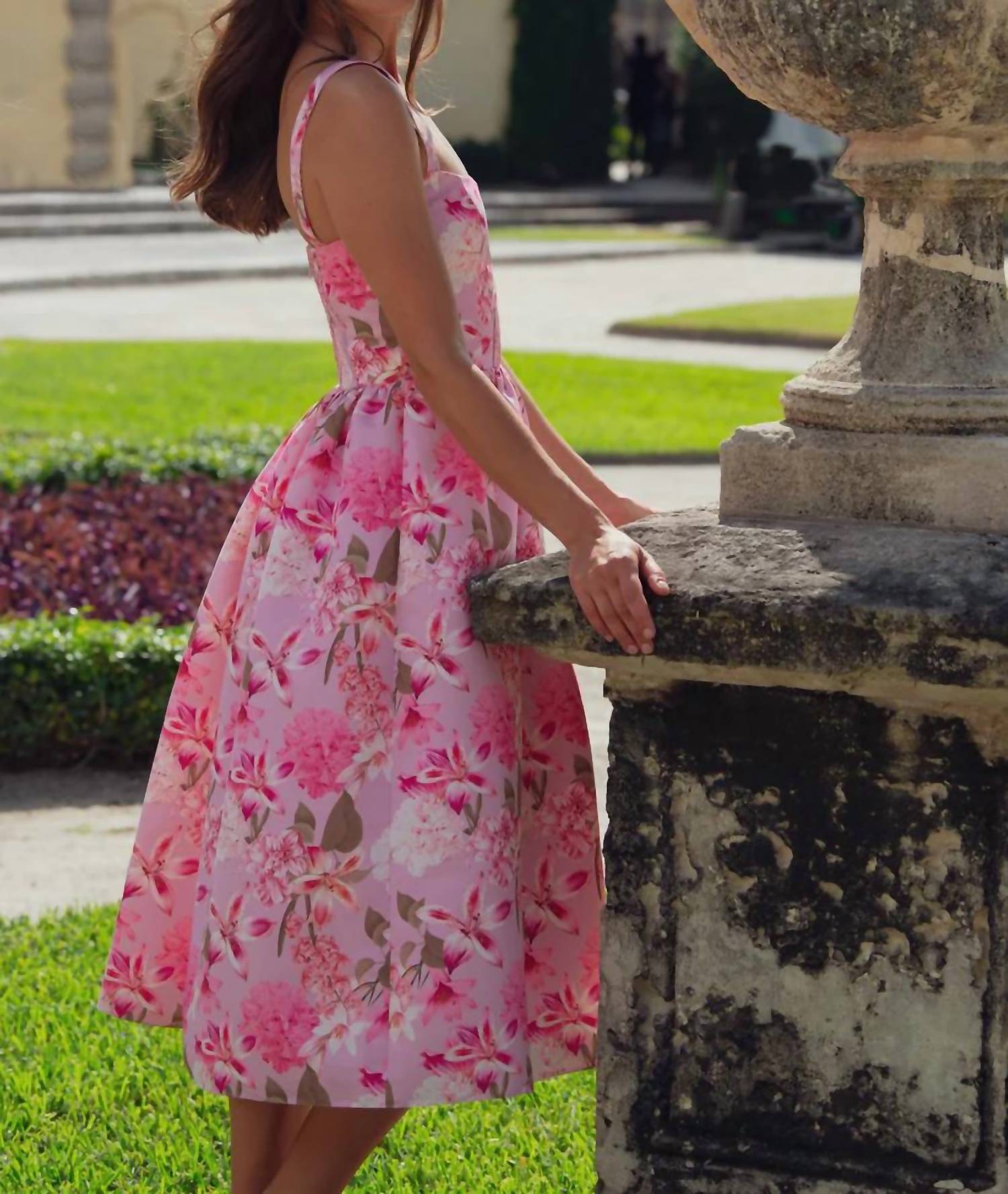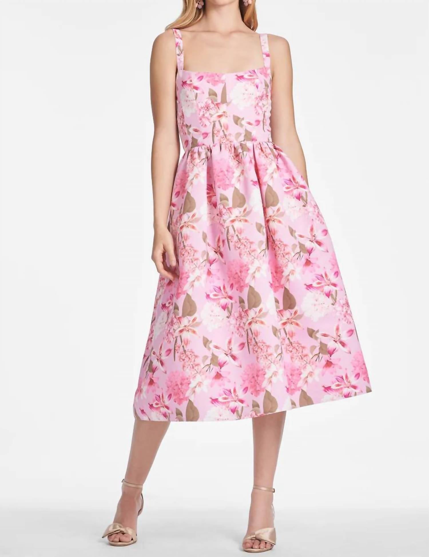 A midi dress so versatile, your options for wearing it are endless. Does it get any sweeter than the Tinsley? She's feminine, sophisticated, and oh so wearable. The square-neck fitted bodice descends into a pleated A-line shape for the most flattering silhouette. This midi will be in your summer event rotation for years to come. Details: Model is 5'11" wearing size 2 48" Long Back Zipper Printed Poly Faille 100% Polyester Imported Style #T241B02-674