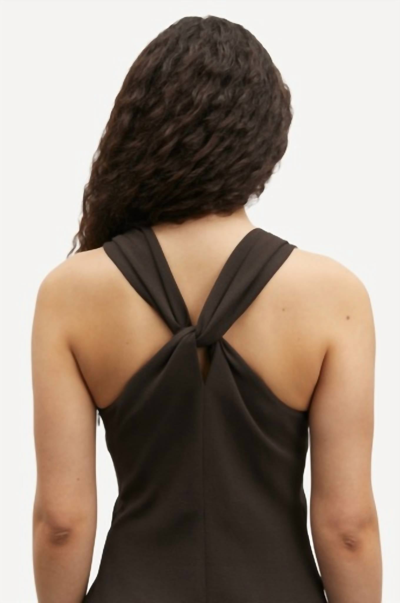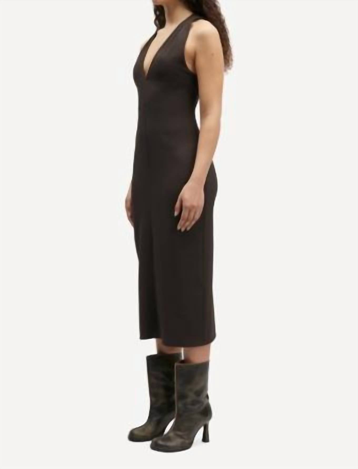 The perfect length dress does exist. Introducing the Samandy Dress by SAMSOE, a chic sleeveless midi in sophisticated Chocolate Torte. Crafted from a 57% recycled polyester-blend with 3% elastane, this piece offers comfort and style with a touch of sustainability. The dress features a flattering V-neck and twisted straps at the back, with an elegant side slit and an invisible side zipper closure ensuring a seamless silhouette. Machine wash at 30 degrees, do not bleach, iron low, do not dry clean, or tumble dry. Model is 179 cm tall and wears a size small.