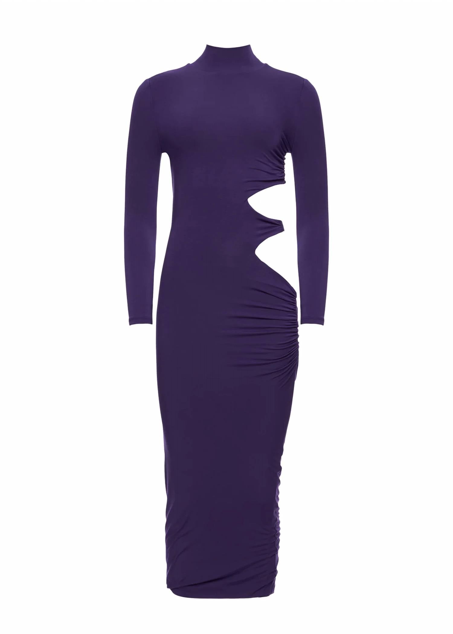 The perfect length dress does exist. Introducing the Chroma Side Cut-out Dress by SER.O.YA, a striking minimalist piece perfect for your next dinner party. This bodycon midi dress in vibrant violet features long sleeves and a stylish turtleneck, with daring side cutouts on the left side to enhance its chic appeal. Crafted from 95% Modal and 5% Spandex, this dress is made in China and measures 49 inches in length. Care for this solid pattern dress by hand washing and laying it flat to dry.