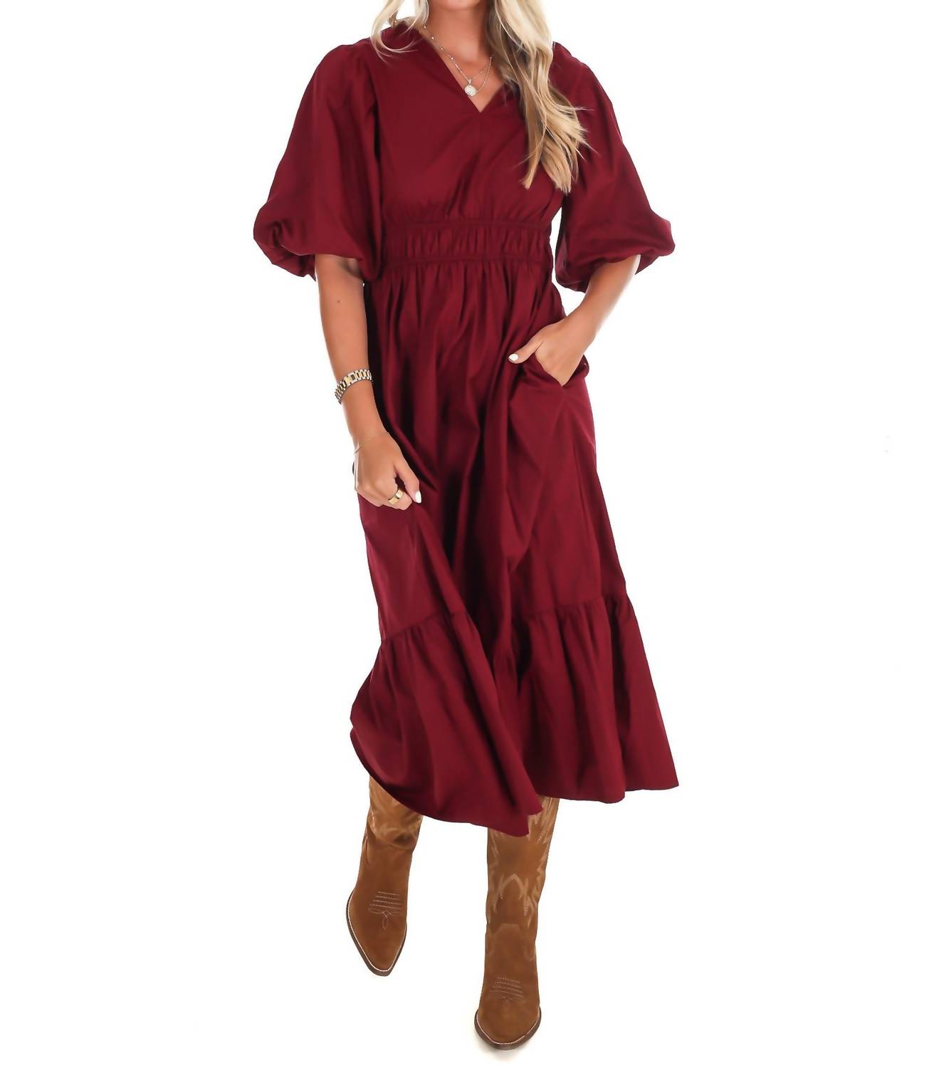 Just add slides or mules and you are good to go. Introducing the Forget Me Not Midi Dress by SHE + SKY, a stunning addition to your holiday party wardrobe. This wine-colored dress boasts short bubble sleeves and convenient side pockets, effortlessly combining style and practicality. The flattering A-line midi silhouette is perfect for both day and night occasions. Composition: Solid pattern design. Closure: Pull on.