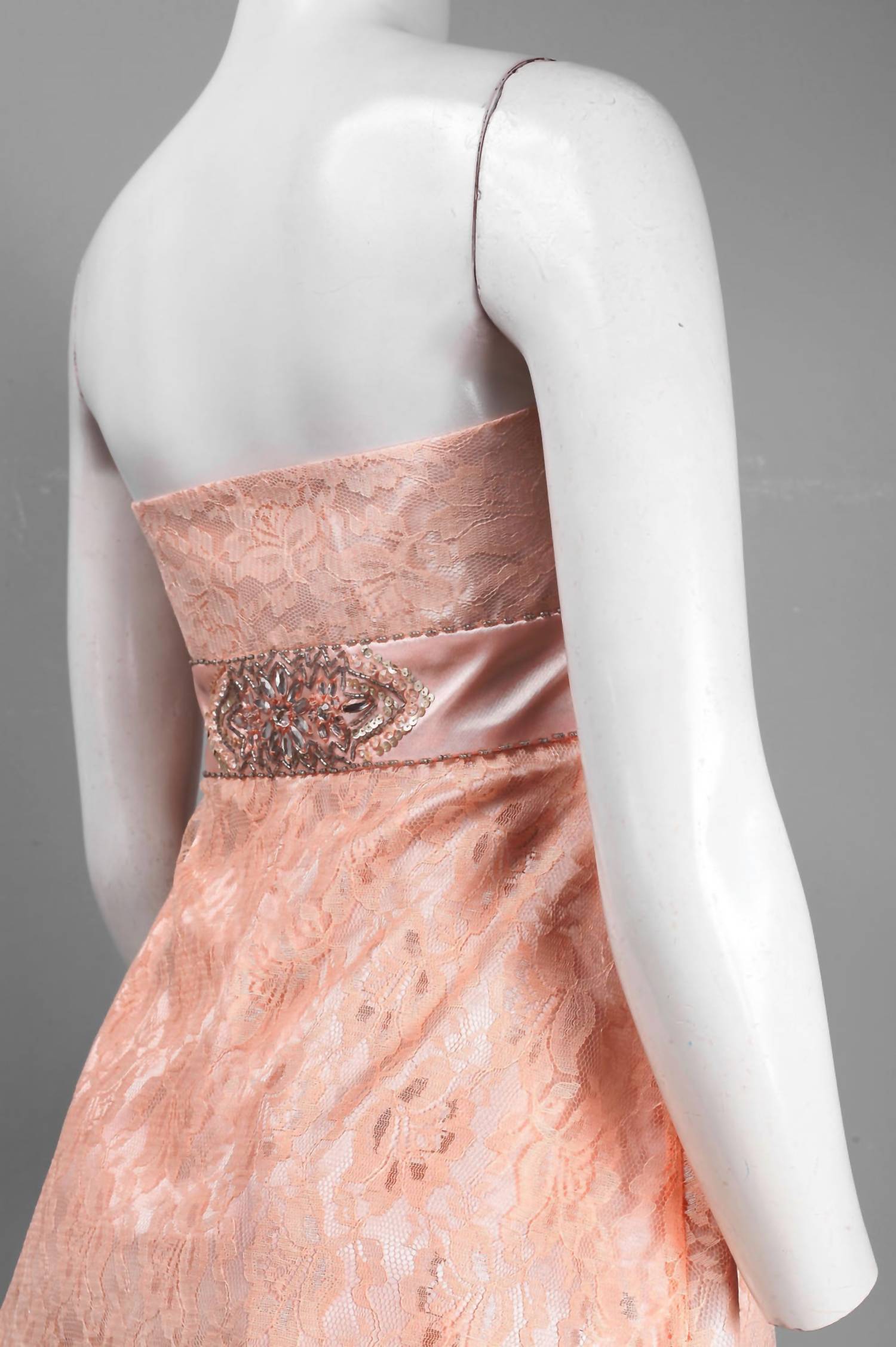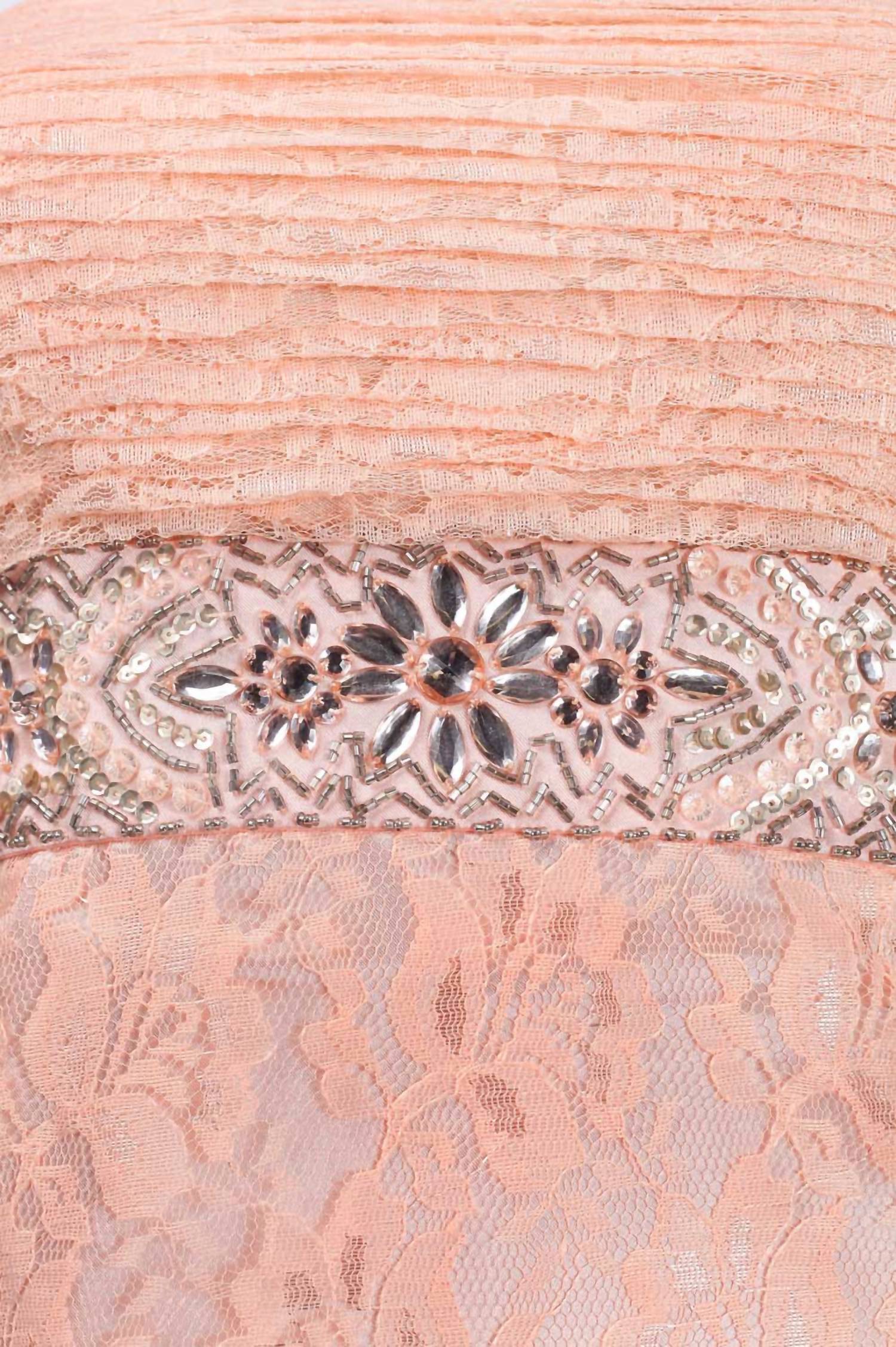 A midi dress so versatile, your options for wearing it are endless. Elevate your cocktail party wardrobe with the Strapless Beaded Empire Balloon Dress by Sue Wong, an exquisite piece in a stunning blush color. This dress features a strapless design, a floral-patterned, pleated lace bodice adorned with assorted beading, sequins, and rhinestones, highlighting its sophisticated empire waist silhouette. Composition: Lace and lining both made from 100% Polyester. Closure: Side zipper. Care instructions recommend spot cleaning to maintain its delicate detailing.