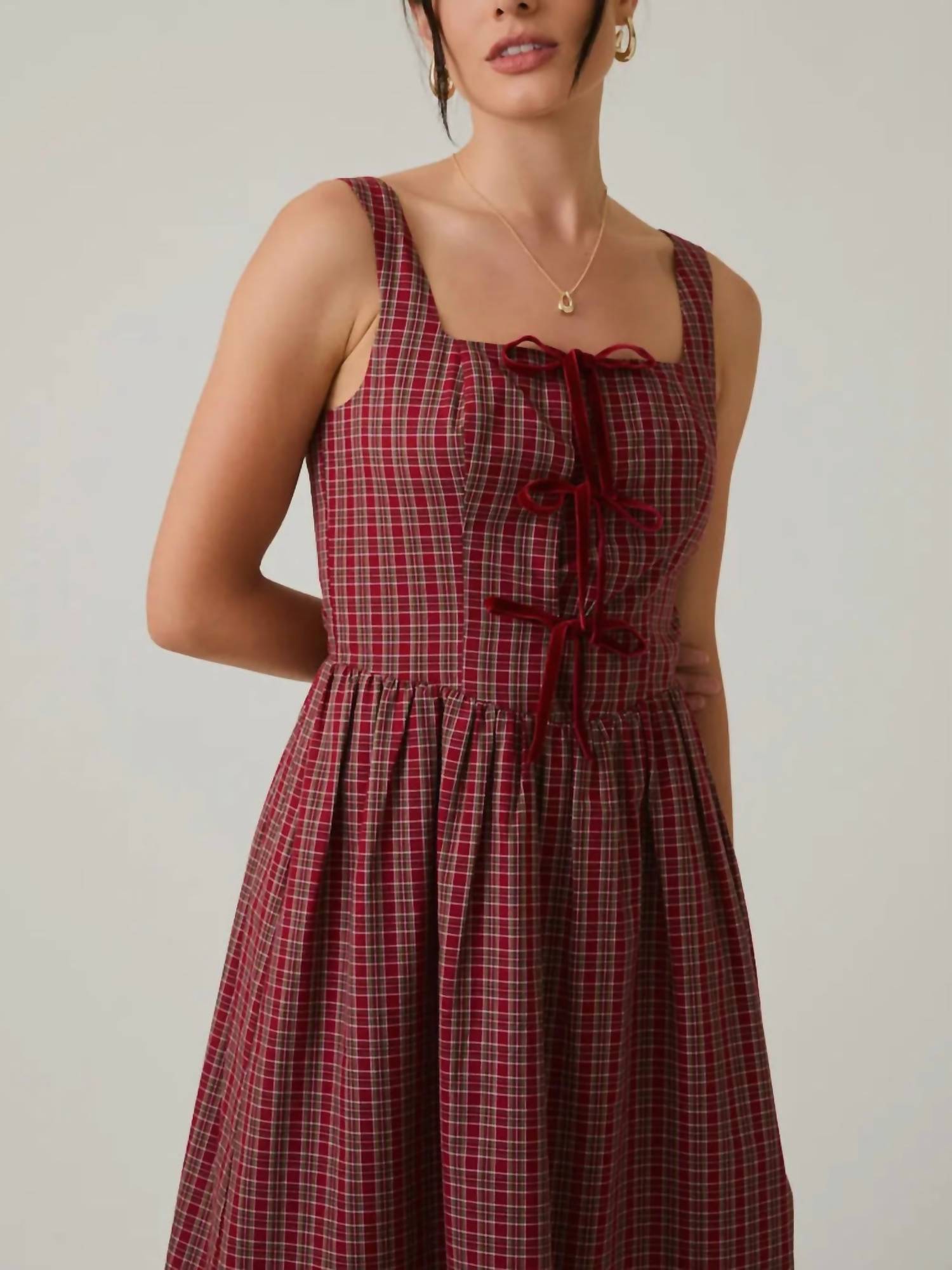 Just add slides or mules and you are good to go. Embrace timeless elegance with the Plaid with Bow Detail Midi Dress by Sunday Edition. Sleeveless and crafted from 100% cotton, this dress features a classic plaid pattern in stunning red, complete with a luxurious velvet bow detail that adds a touch of sophistication. Its A-line silhouette and midi length provide a universally flattering fit, ideal for engagements or festive Thanksgiving gatherings. Care is simple with machine wash instructions.