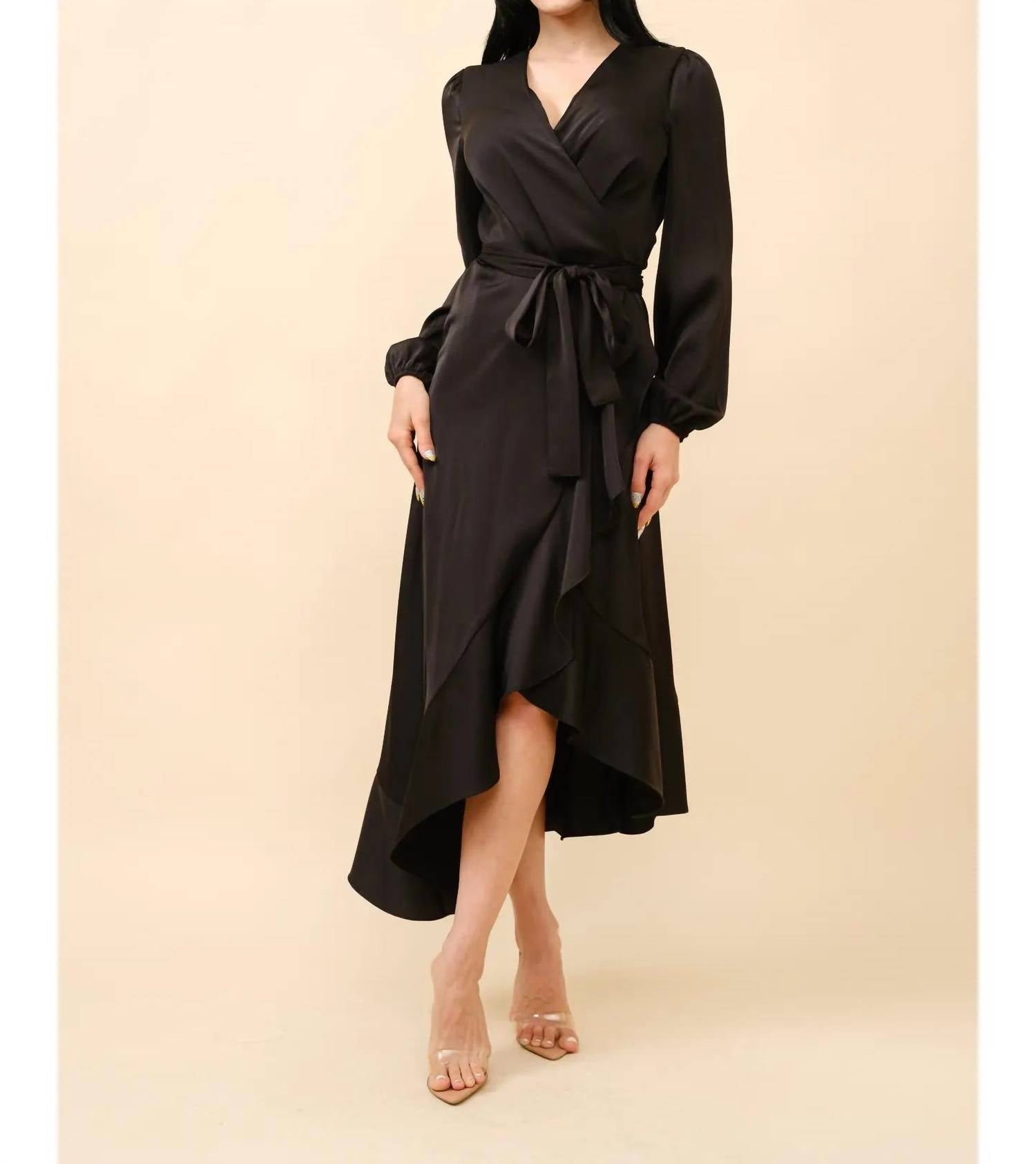 Just add slides or mules and you are good to go. Elevate your wardrobe with the Tea & Cup Ruffle Hem Wrap Midi Dress, a stunning choice for any cocktail party. Designed in a solid black hue, this long sleeve dress features a flattering V-neckline and charming ruffle hem, perfect for capturing effortless elegance. Crafted with 96% polyester and 4% spandex, it ensures a comfortable fit with a chic tie closure. Care instructions recommend dry cleaning to maintain its luxurious finish, available in sizes small, medium, and large.