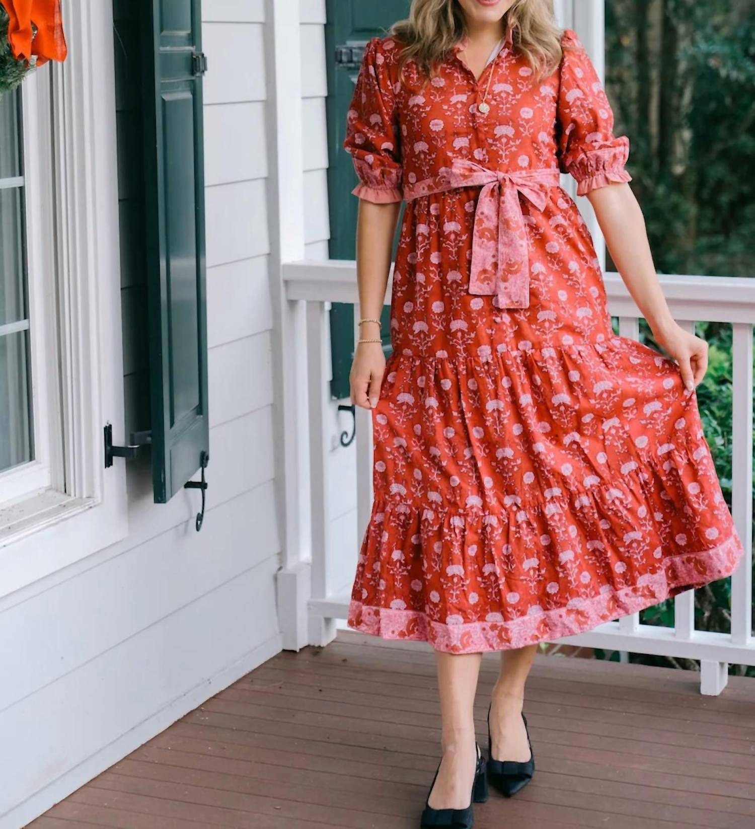 The perfect length dress does exist. Discover the Brooke Midi Dress by VICTORIA DUNN, a floral masterpiece perfect for your next holiday party. This elegant piece in rich Merlot features elbow-length puff sleeves with contrasting ruffle cuffs and a ruffled collar for added flair. Expertly hand-crafted by artisans in Jaipur, India, the dress is made from 100% cotton and lined for comfort. Closure: Front button placket. Care: Hand wash only. Model is wearing a size XS.