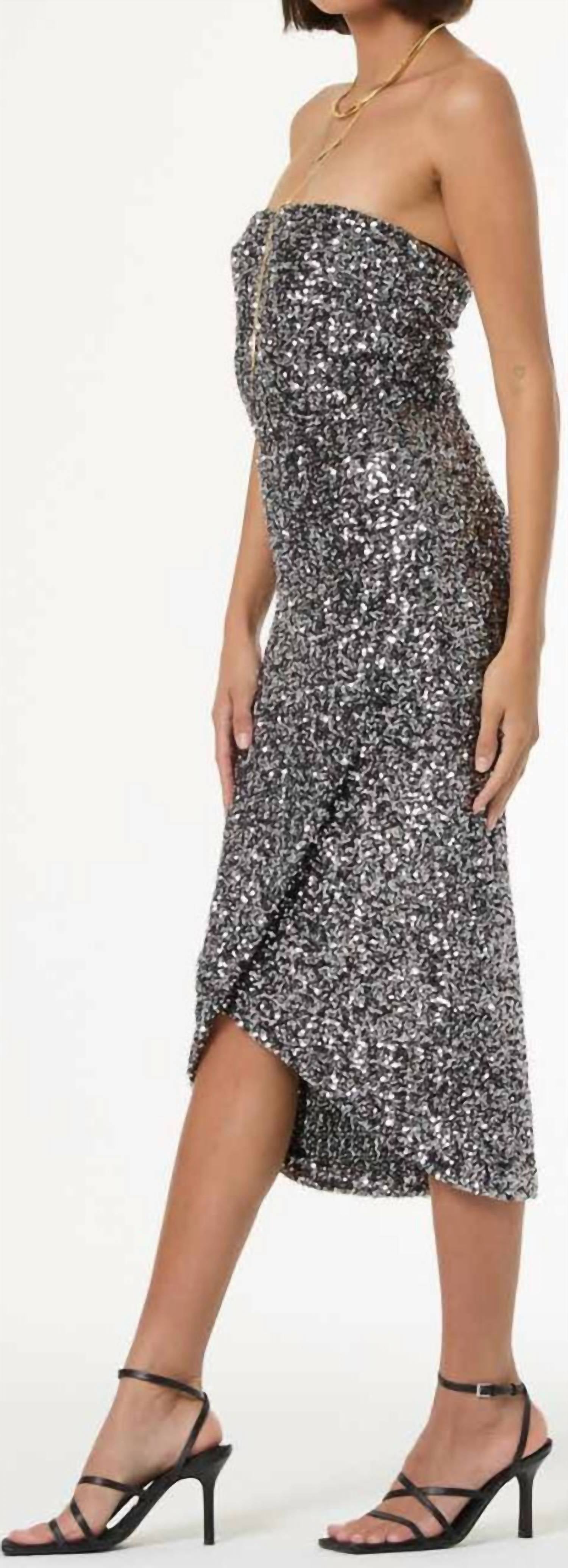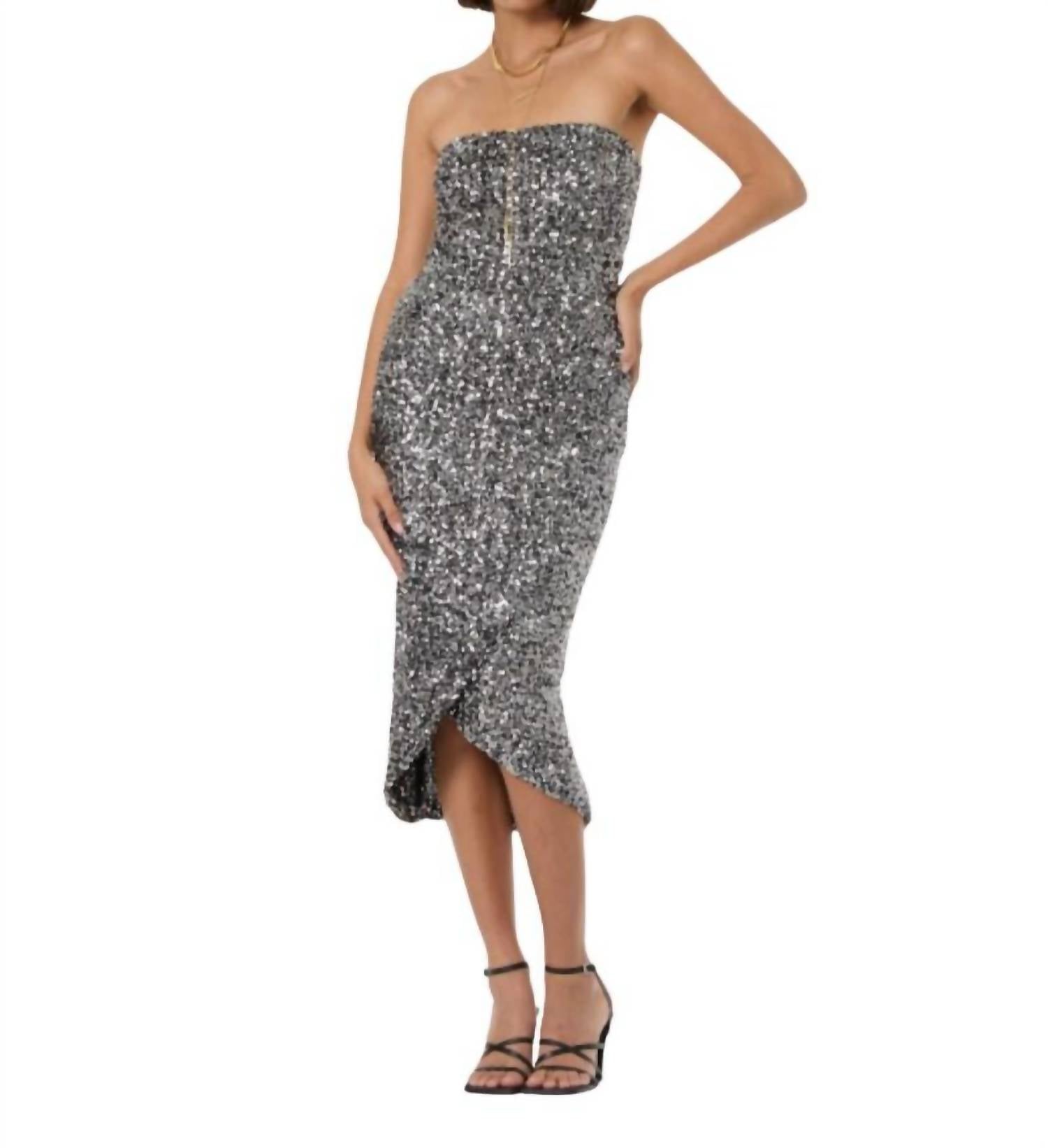 A midi dress so versatile, your options for wearing it are endless. Elevate your evening look with the Zodiac Strapless Dress by Young Fabulous & Broke, a captivating sheath silhouette in fire silver two-tone sequins. This chic midi dress, made for women, features an off-the-shoulder neckline and an uneven hemline for added intrigue. Stay true to size with its comfortable stretch and zip closure, perfect for your next maximalist evening event. Care instructions advise against washing to maintain its stunning textured finish.