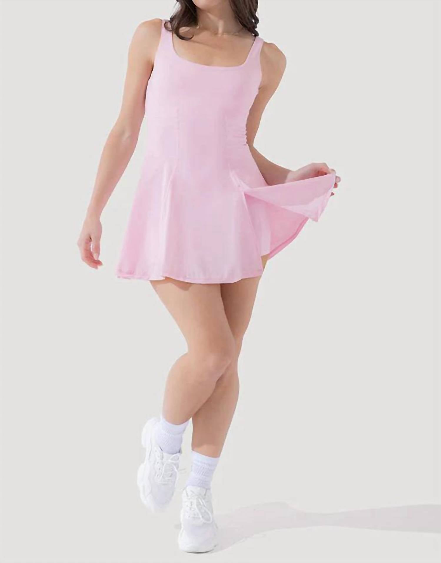 The perfect mini dress for those warmer months. Elevate your tennis or pickleball game with the Tie-Breaker Superdress by POPFLEX Active in a Perfect Pink shade. This sleeveless mini dress features a square neckline, adjustable shoulder straps, and deep pockets in the built-in shorts for added convenience. Crafted from a blend of 85% Nylon and 15% Spandex, it's designed for a snug fit with a playful slit and pull-on closure. Built-in short inseam lengths vary by size, ensuring a custom fit for each wearer. Perfect for summer athleisure looks and fitness occasions.