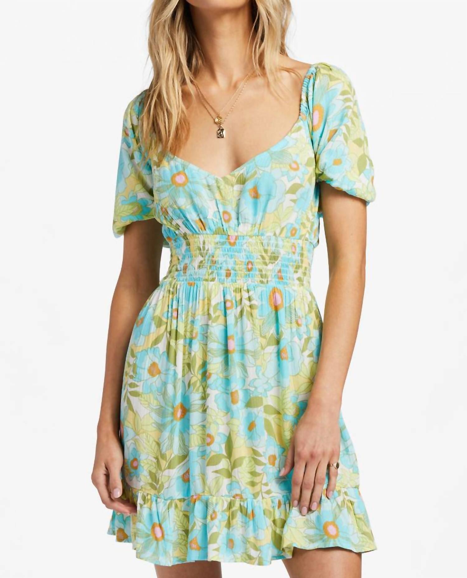 A short and breezy dress for those warmer days. Elevate your spring wardrobe with the Something Pretty Dress by Billabong, part of the Summer Folk Collection in the Ocean Eyes floral print. Featuring short puff sleeves and a striking fit-and-flare silhouette, this mini dress captivates with its smocked waistband and ruffled skirt. Crafted from 100% crinkle viscose, its airy design ensures comfort and style. Closure: Pull on. Ideal for a boho chic summer vacation, the dress highlights a flattering V-neckline.