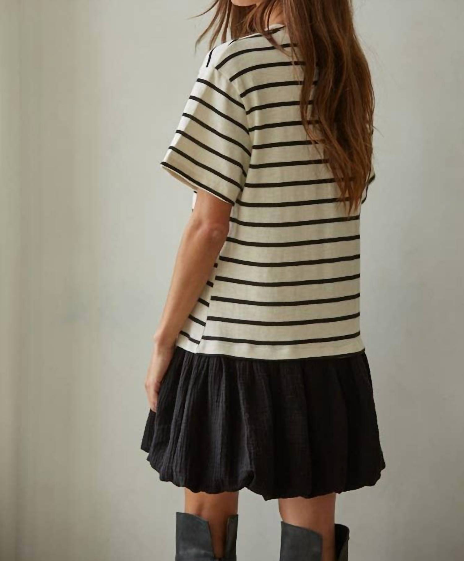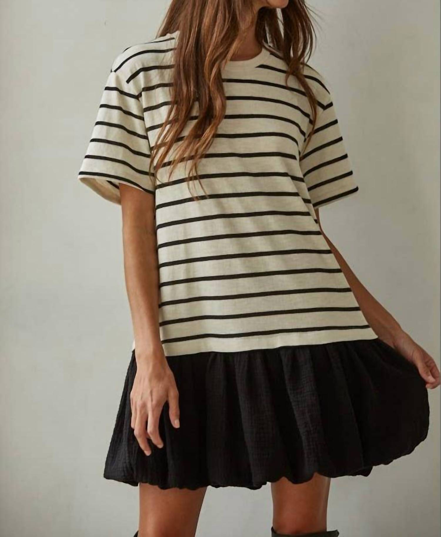 A short and breezy dress for those warmer days. The Striped Bubble Dress by By Together is a fun addition to your spring wardrobe, ideal for vacation and embracing 90s fashion. This ivory and black mini dress features a crewneck and short sleeves, offering a comfortable fit with its cotton-blend material. Designed with side pockets for convenience, it showcases a classic striped pattern with an attached polyester lining. It's a pull-on style dress with a relaxed shift silhouette, perfect for effortless style.