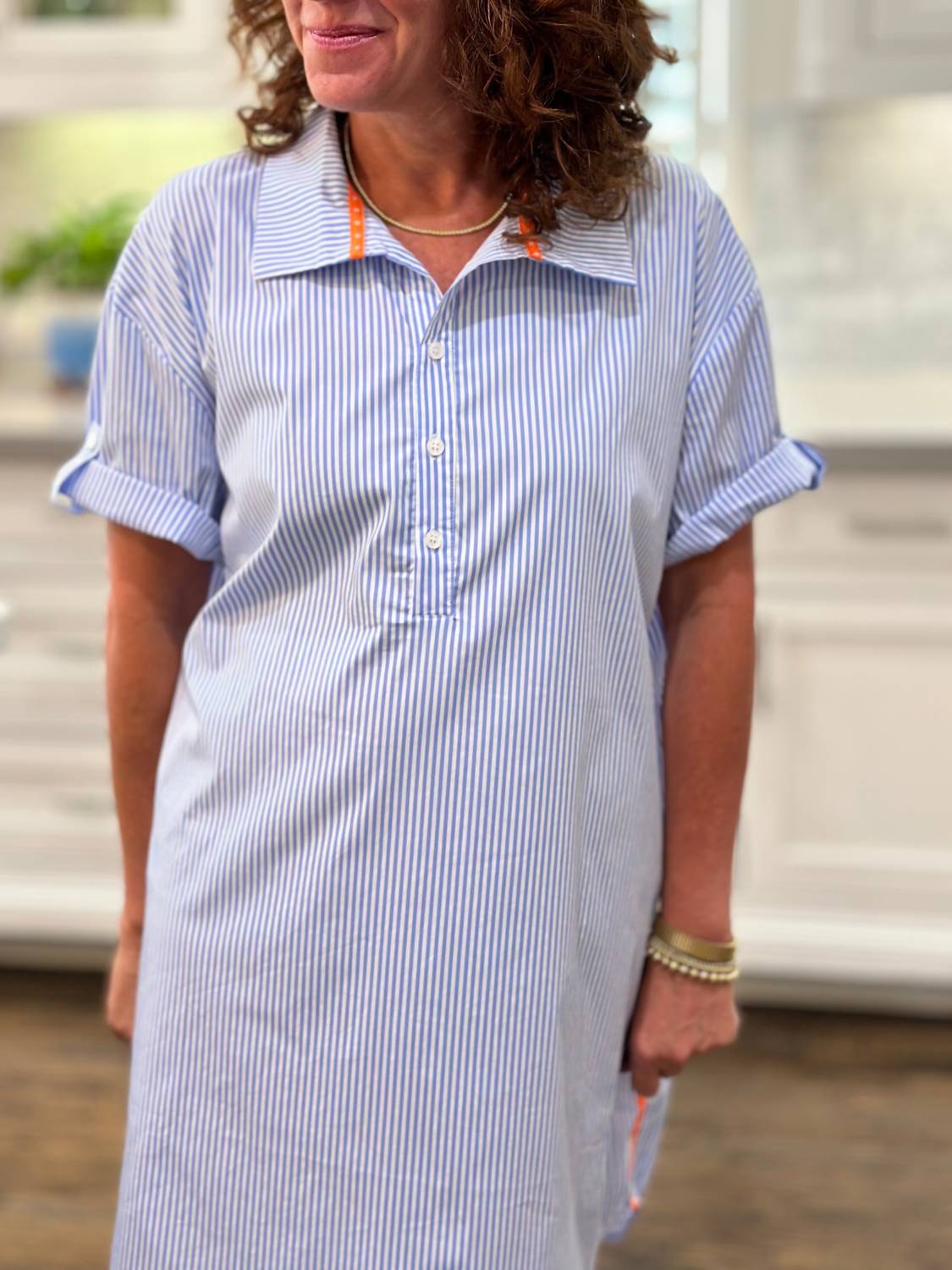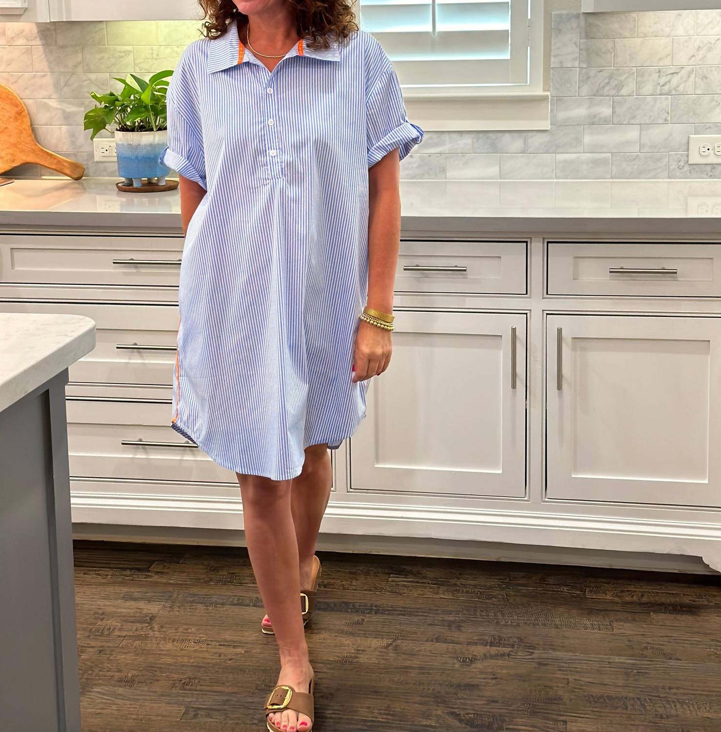 The perfect mini dress for those warmer months. The Women's Jackie Dress by Caryn Lawn is a chic vacation-ready piece in a refreshing blue stripe. With a cotton poplin composition, this dress offers a comfortable, oversized, and relaxed shirt silhouette featuring short sleeves and a collar neckline. Its button closure enhances the laid-back style of this mini dress, designed to easily fit sizes 4-12. Crafted without pockets, it's perfect for summer streetwear enthusiasts.