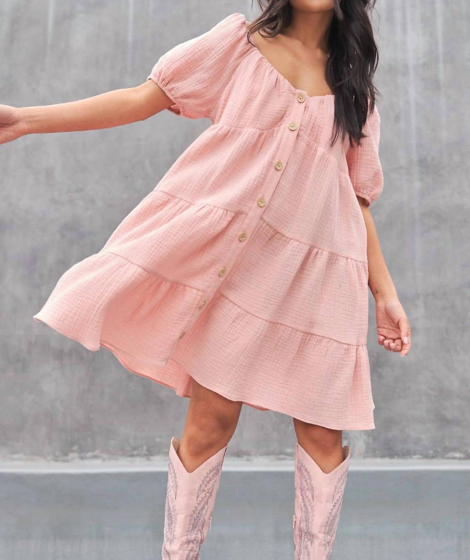 The perfect mini dress for those warmer months. Embrace the spirit of Boho Chic with the Solid Gauze Balloon Sleeve Tiered Mini Dress by Ces Femme in a vibrant pink hue. This vacation-ready mini dress features short puff sleeves and an A-line silhouette with an off-the-shoulder neckline, perfect for a breezy summer look. Made from gauze fabric, it offers a textured pattern and practical side pockets for added convenience. Closure is pull on, with no specific care instructions provided.