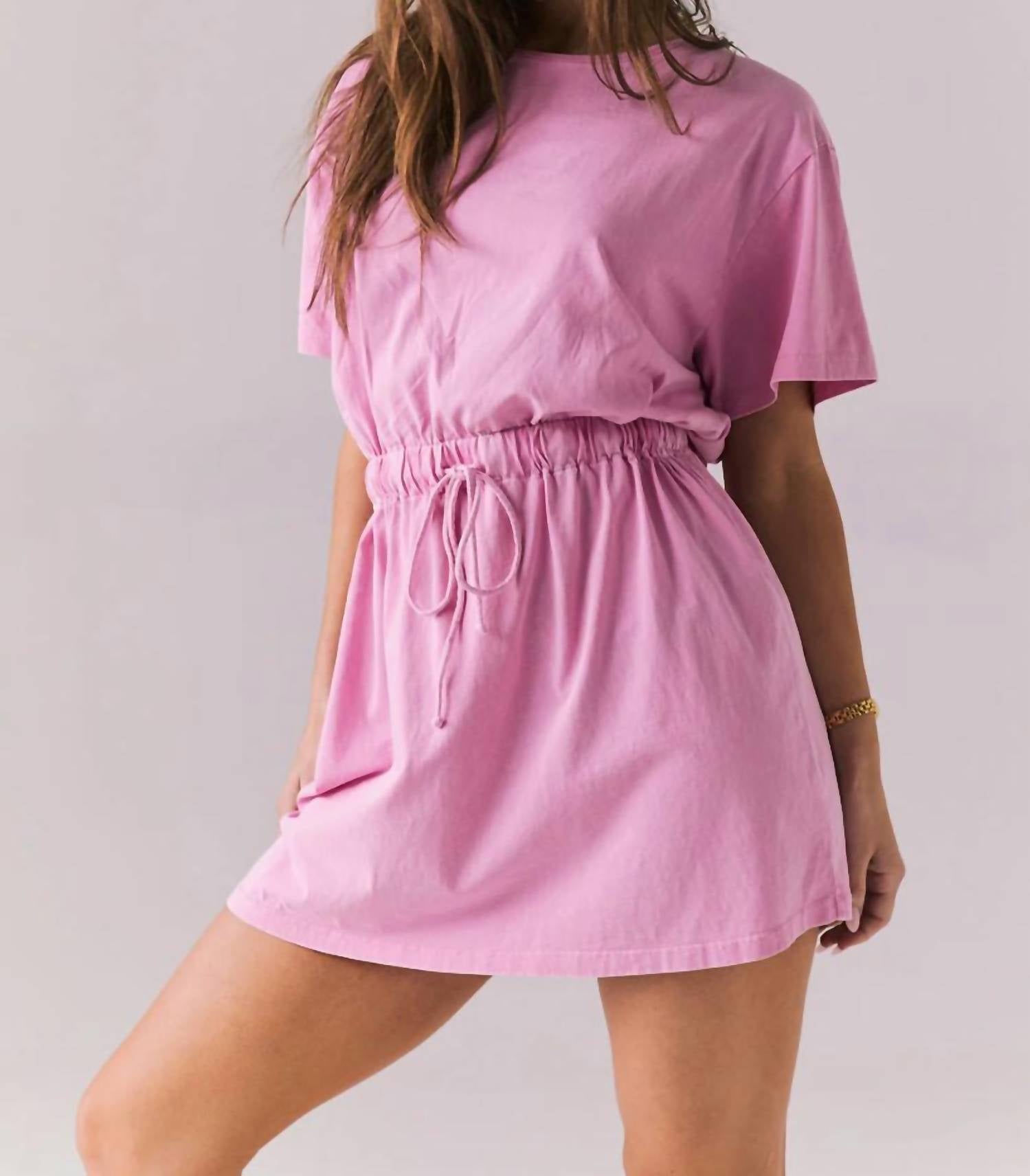 The kind of easy and flattering dress you'll be reaching for all season long. Perfect for embodying retro 90s aerobics charm with a modern twist. Mini t-shirt dress offers a trendy pull tie at the waist, enhancing its playful silhouette. Composed of 100% Cotton. Pull on style. Hand wash. Designed for women, this dress effortlessly suits spring streetwear and travel occasions. Model is 5'9" and wears a size small.
