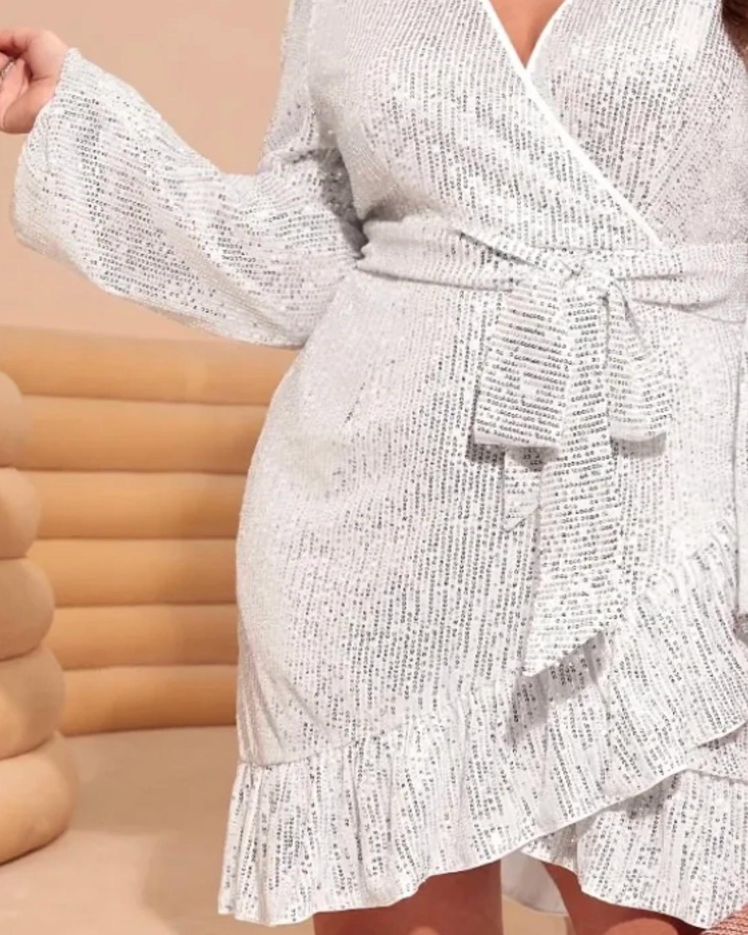 The kind of easy and flattering dress you'll be reaching for all season long. Elevate your cocktail party look with the Lola Silver Sequined Dress from Curve Market, designed for those who love to shine. This short-sleeve mini dress is a spring must-have, featuring a textured, wrap silhouette with a v-neckline. Made from 100% polyester, it offers a tie closure and is lined for added comfort. Imported, this piece reflects the quiet luxury trend, perfect for a dazzling New Year's Eve celebration.