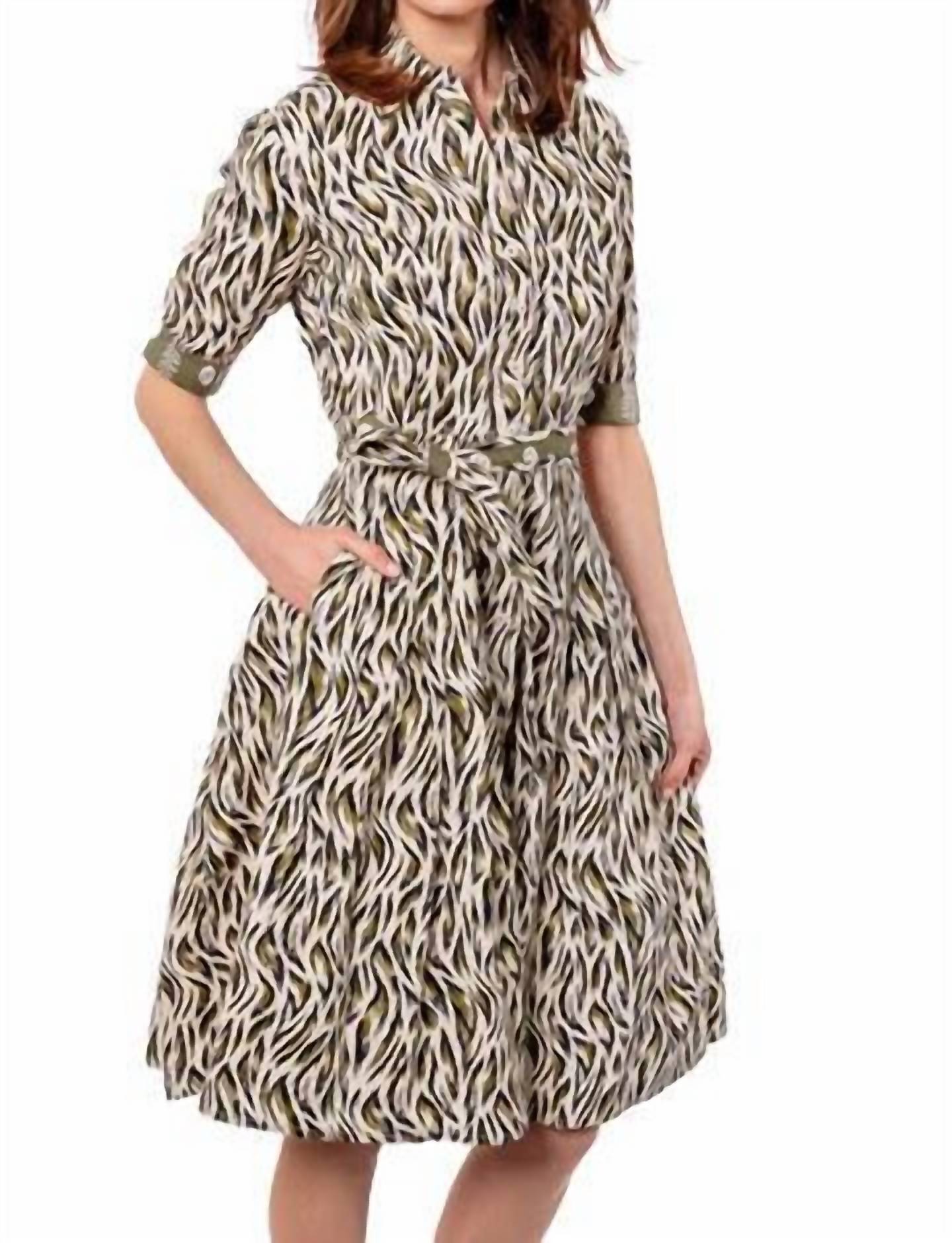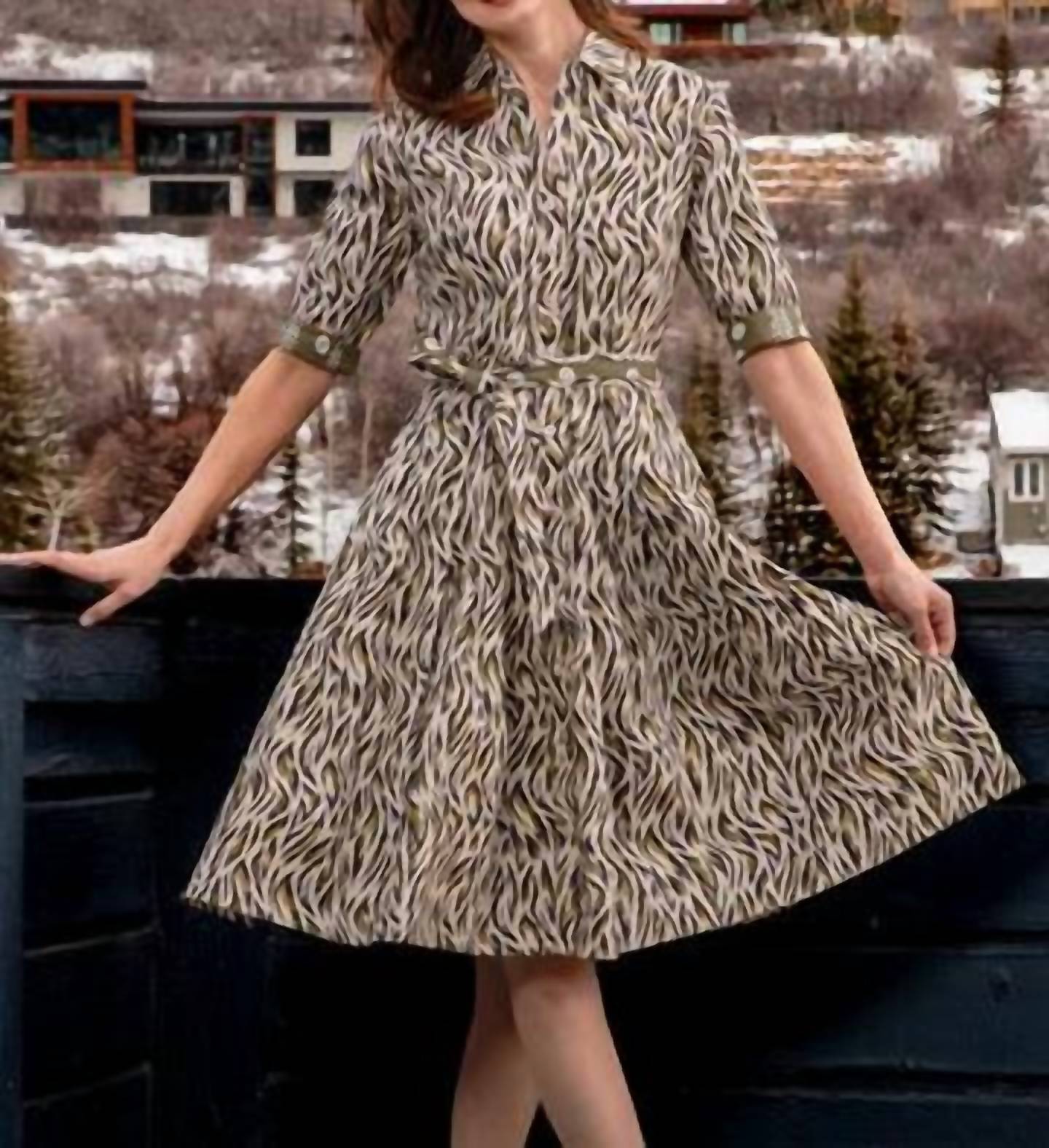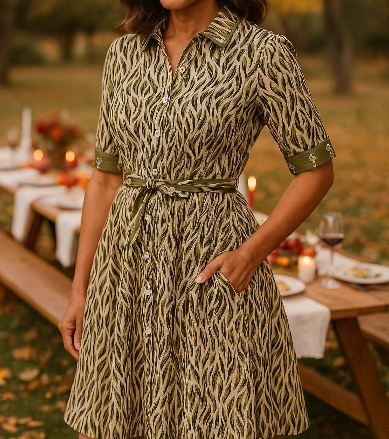 The kind of easy and flattering dress you'll be reaching for all season long. The Mrs. Maisel Print Dress by Dizzy-Lizzie is a charming piece that seamlessly integrates elegance and style. Featuring three-quarter sleeves and a collared neckline, this shirt dress in olive green with a flame pattern is crafted from a cotton blend (95% Cotton, 5% Spandex). The dress is of midi length and includes a double-face tie belt and side pockets for added convenience. Closure: Button closure. Perfect for a holiday party or chic daily wear, it's a great addition to your spring wardrobe.