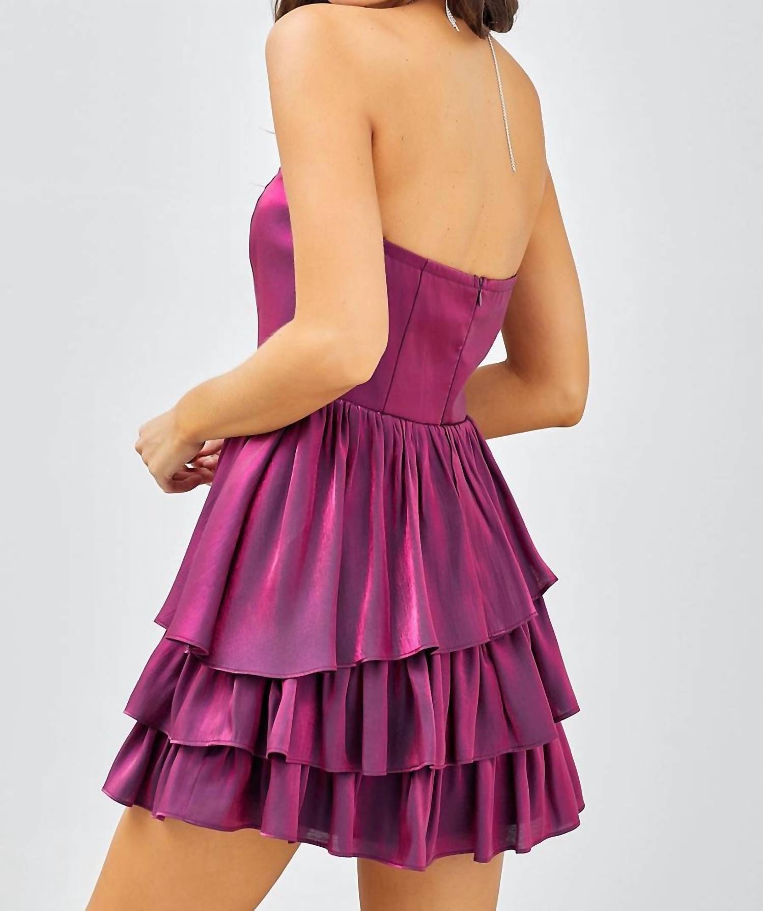 A short and breezy dress for those warmer days. Introducing the Strapless Ruffle Dress by DO+BE in an enchanting Midnight Orchid hue, perfect for your next holiday party. This minimalist A-line mini dress showcases a flattering strapless, sweetheart neckline for a chic silhouette. Closure: Zip closure. Model is wearing size S (5'9" height, 32" bust, 24" waist, 34" hip).
