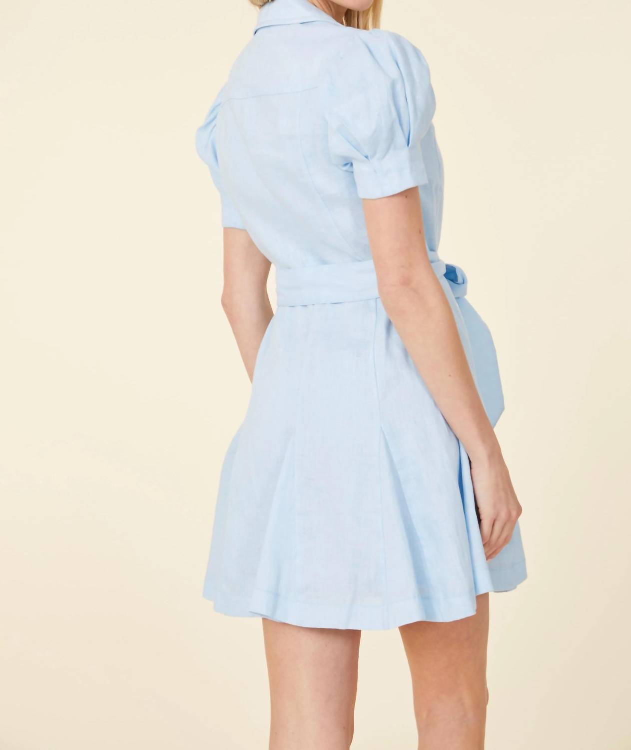 The kind of easy and flattering dress you'll be reaching for all season long. Elevate your holiday party look with the Linen Belted Mini Dress by Dolce Cabo, crafted from lightweight linen in an elegant light blue hue. This A-line dress features short sleeves, a collared neckline, and a button closure that flows into a flattering belted waist and a pleated, flirty silhouette. A minimalist solid pattern makes it a versatile addition to your spring wardrobe. Care: Dry clean only.