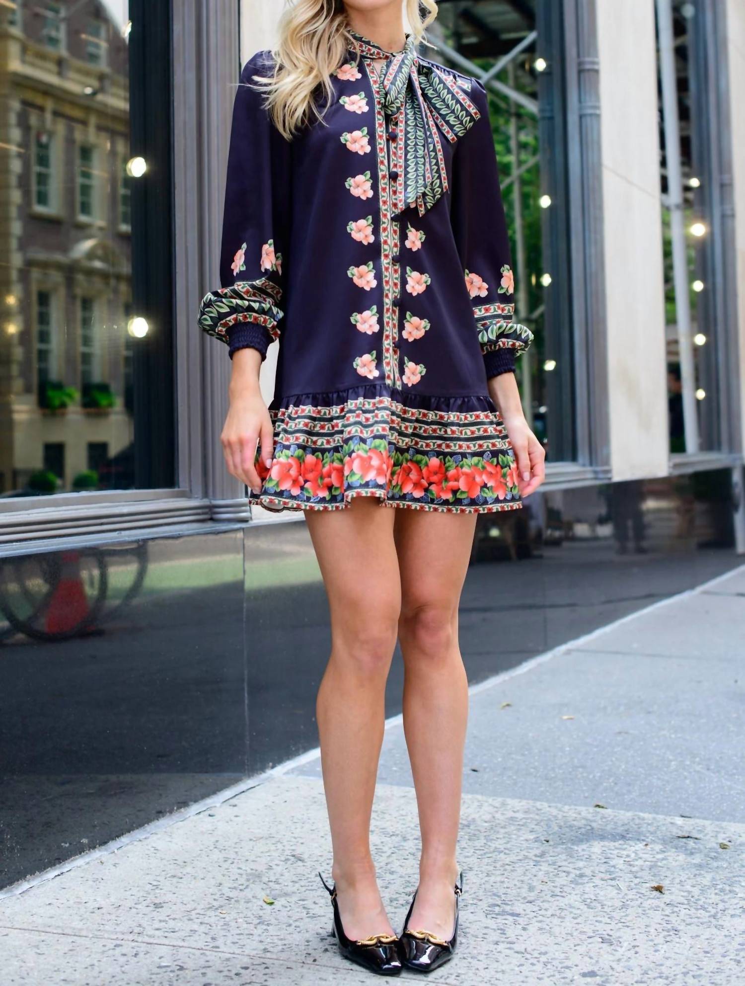 The perfect mini dress for those warmer months. Introducing the Brit Bow Mini Dress by Elizabeth James The Label, a chic addition to your fall wardrobe in a captivating Garland Stripe floral pattern. This satin mini dress features long puff sleeves with smocked cuffs, a bow-tied collar, and a playful swingy ruffle hem. Its easy, above-the-knee silhouette is perfect for both work events and holiday parties. Closure: Hidden button placket.