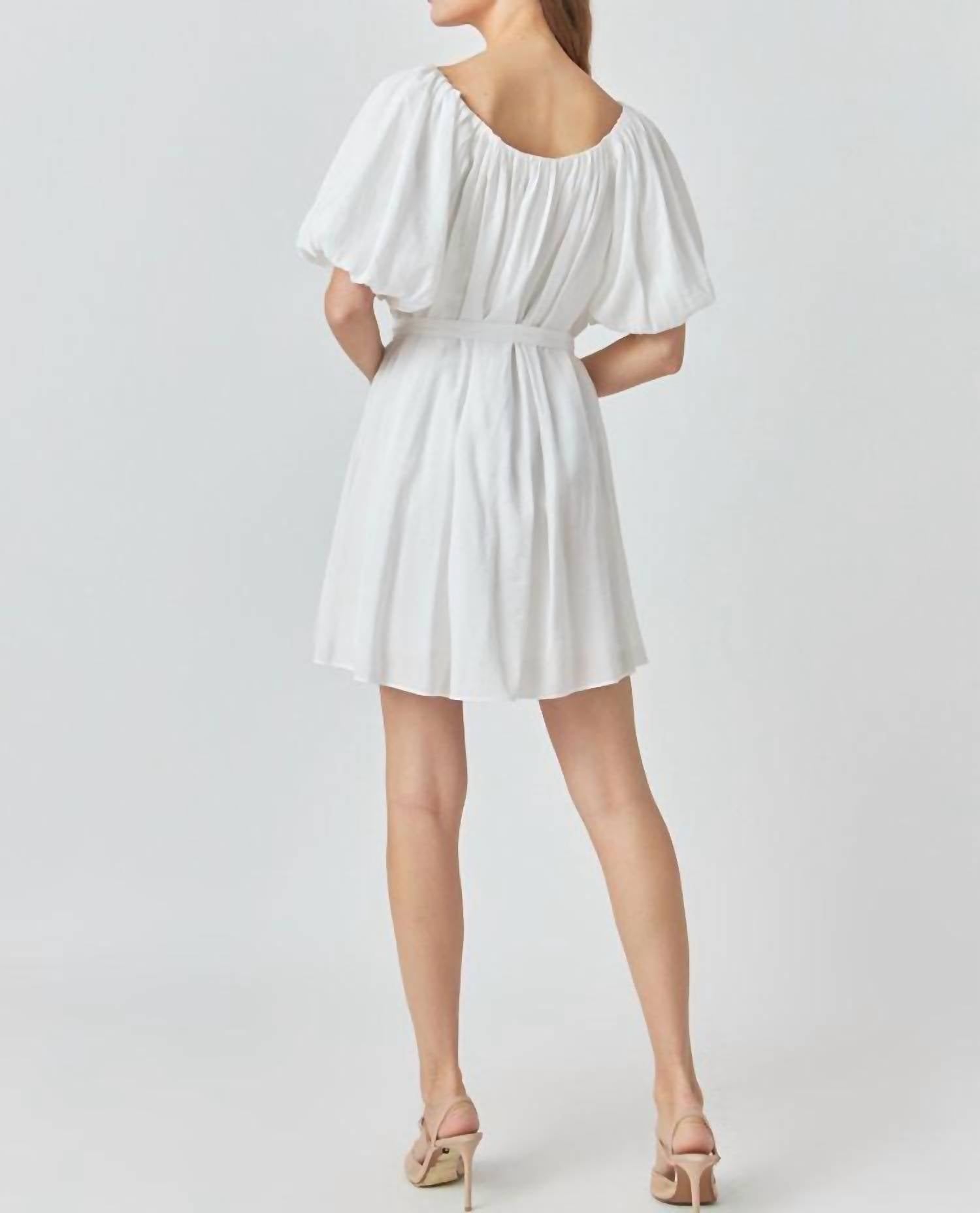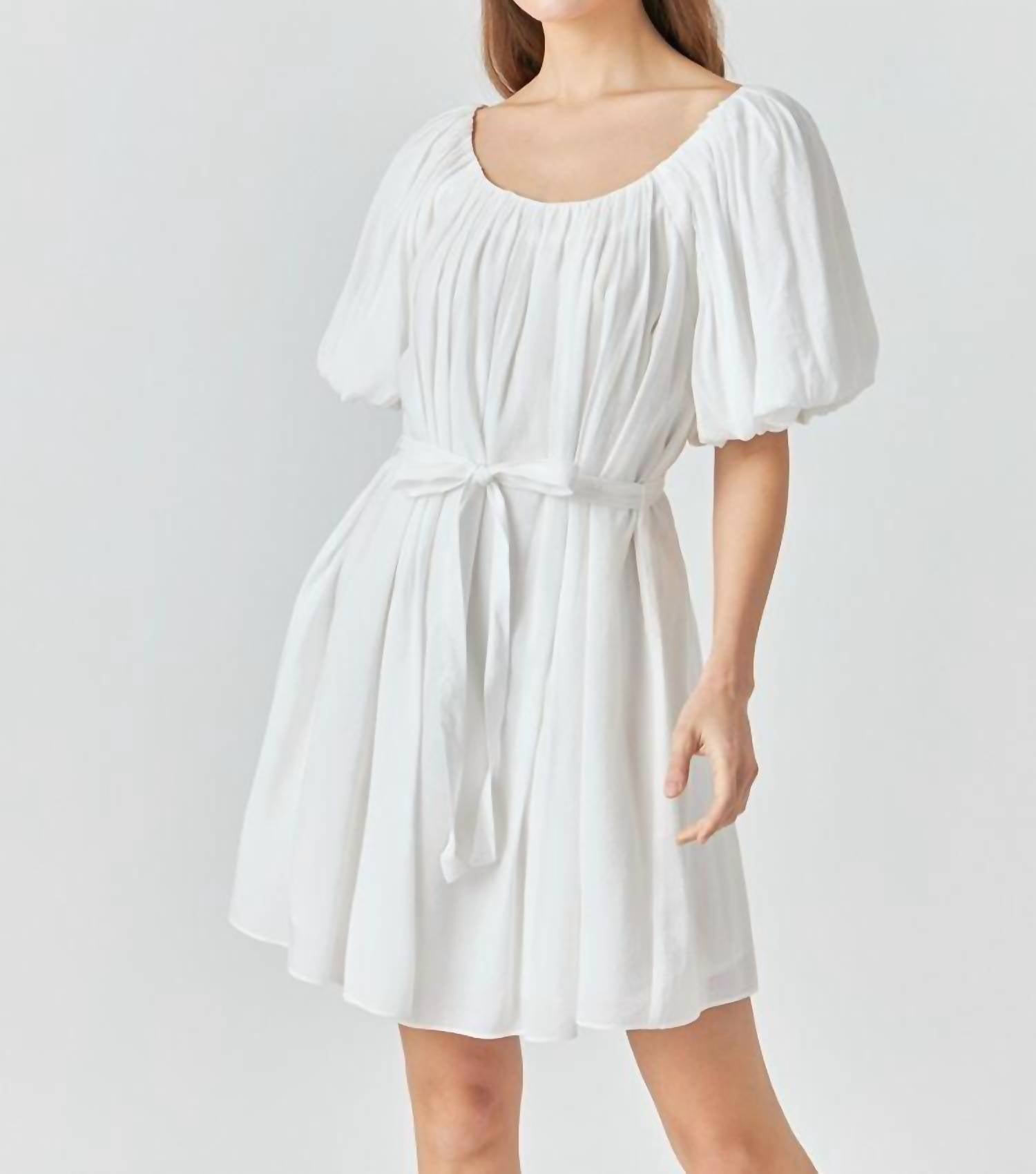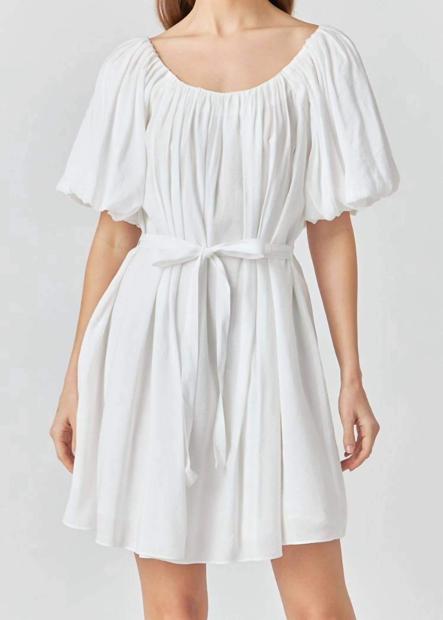 The perfect mini dress for those warmer months. The Eloise Pleated Puff Sleeve Mini Dress by Endless Rose is a chic addition to your summer wardrobe. With short balloon sleeves and a sophisticated scoopneck, this A-line mini dress is designed for both style and comfort. Made from a cotton blend, with a shell composition of 90% cotton and 10% polyester, it features a luxurious lining made of 100% cotton. Easy to maintain, simply machine wash and line dry for continued wearability. Perfect for travel and 4th of July celebrations, this solid white dress is a statement piece for any occasion.