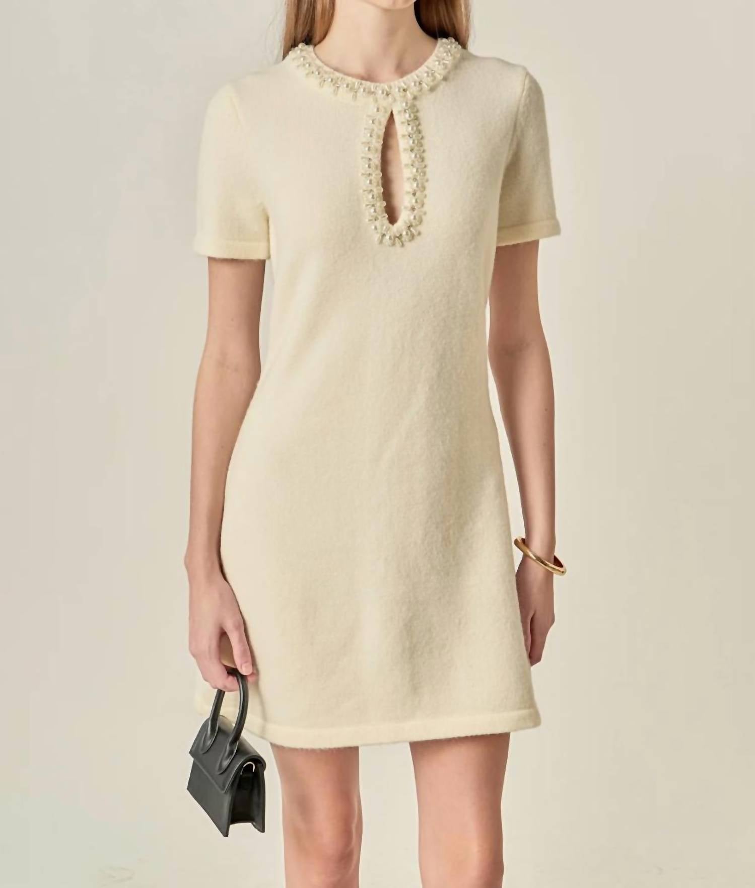 The kind of easy and flattering dress you'll be reaching for all season long. Introducing the Pearl Embellished Knit Mini Dress by English Factory, perfect for adding a touch of glamour to your wardrobe. This beige mini dress features short sleeves and a crewneck, combining comfort with chic sophistication. Made from a soft blend of 44% Acrylic, 31% Polyester, and 25% Spandex, its pull-on closure and ribbed knit construction ensure a flattering fit. Ideal for evening events or date nights, this textured, minimalist piece is a must-have for fall.
