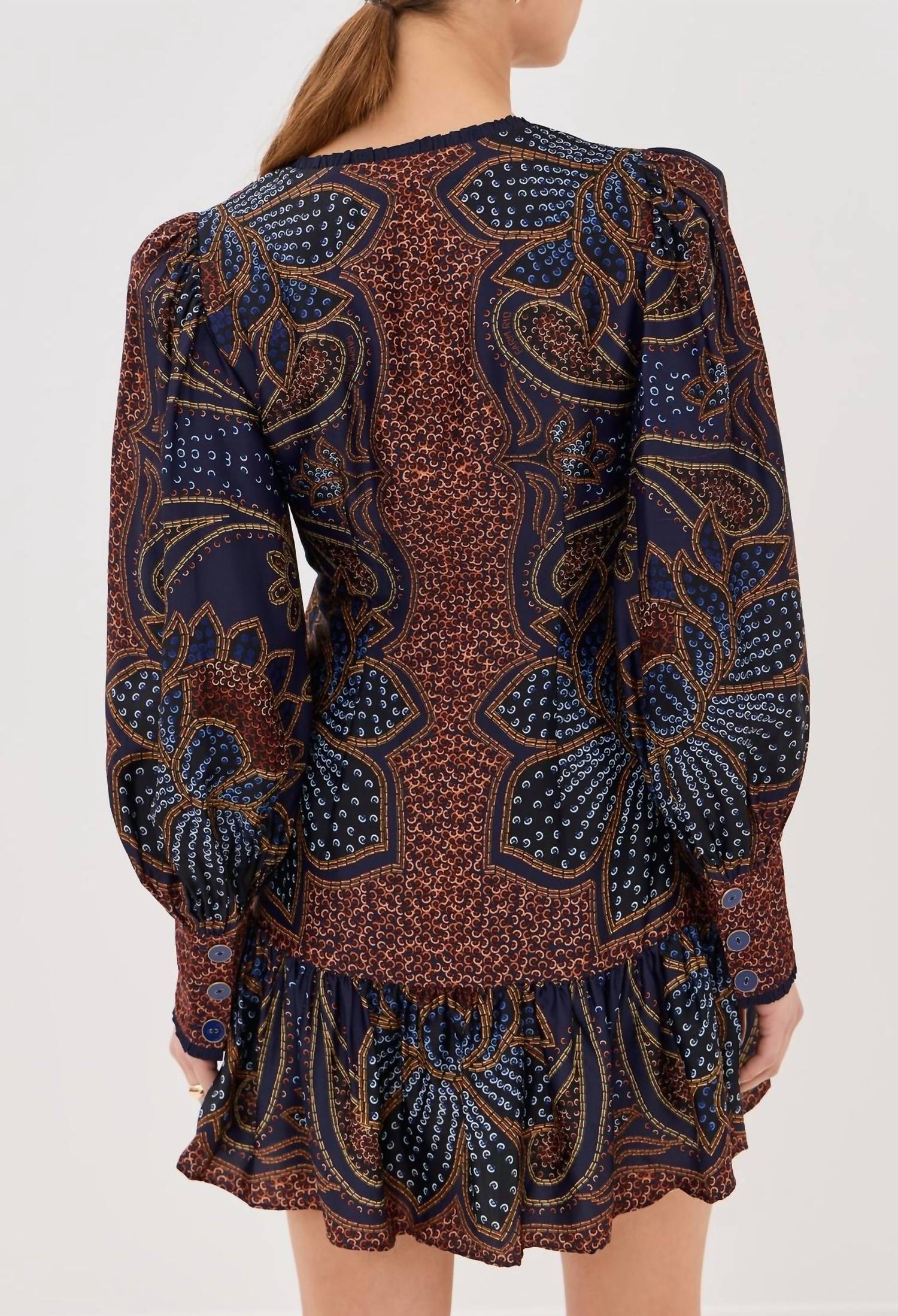 A short and breezy dress for those warmer days. Embrace a touch of 90s elegance with the FARM RIO Long Sleeve Floral Mini Dress in Floral Glam Blue. Crafted from 100% viscose, this lightweight and silky weave dress features a bias cut and ruffle trim that adds flair to its A-line silhouette. Designed with a sophisticated V-neck and button cuffs, it includes a button placket and hidden side zip for easy wear. Made in China, its length is 32.25 inches and should be machine washed cold and laid flat to dry.
