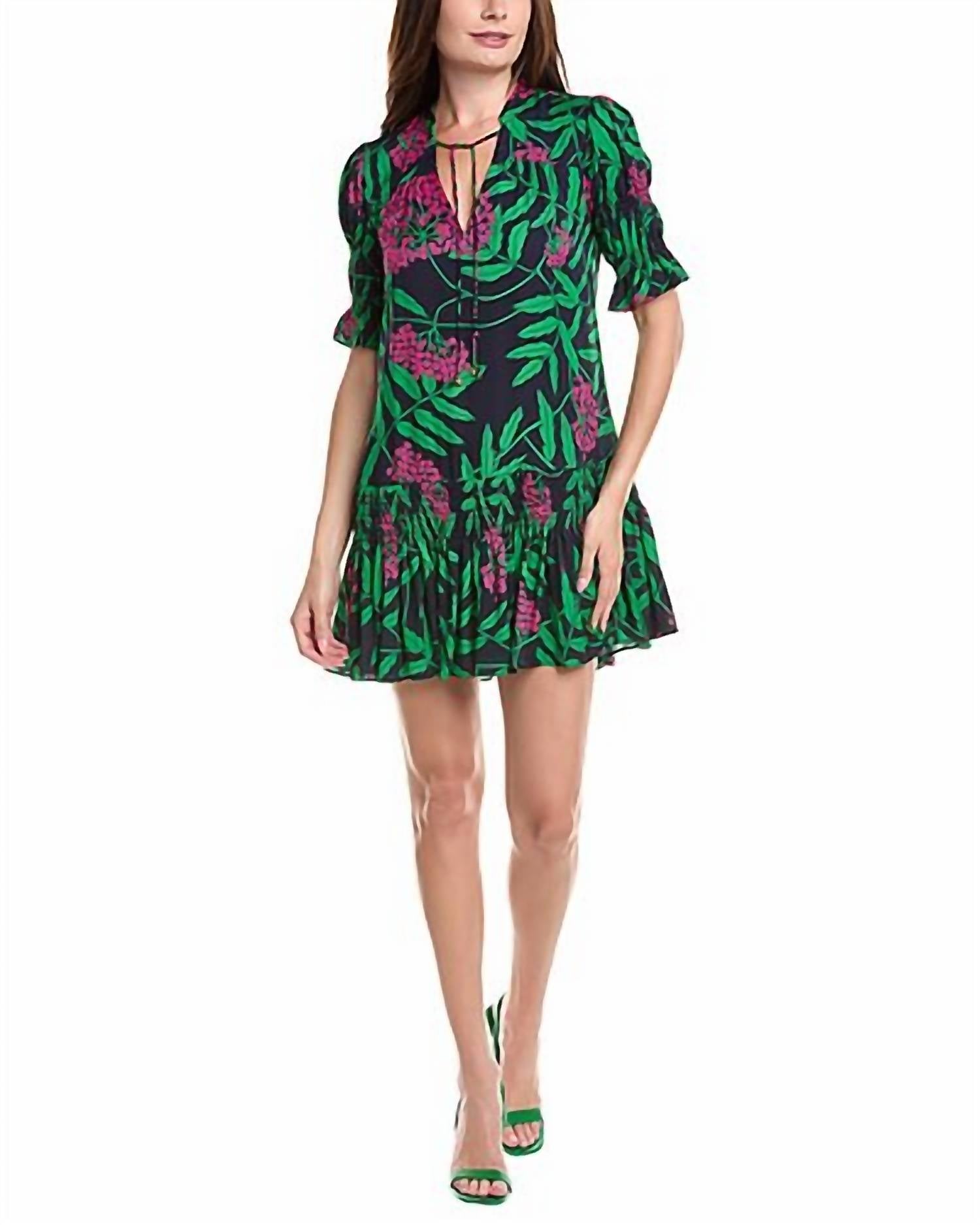 The kind of easy and flattering dress you'll be reaching for all season long. Introducing the Flora Bea Hartlie Mini Dress in captivating Poppy Navy, a perfect choice for a boho chic style this spring. This dress features elegant elbow-length smocked sleeves and a nuanced shift silhouette, enhanced by its luxurious 100% silk composition. The design is detailed with a tie neck closure for an added touch of sophistication, while the garment falls approximately 34 inches from shoulder to hem. For best care, dry clean only. Model is 5'10.5" and wears a size small.