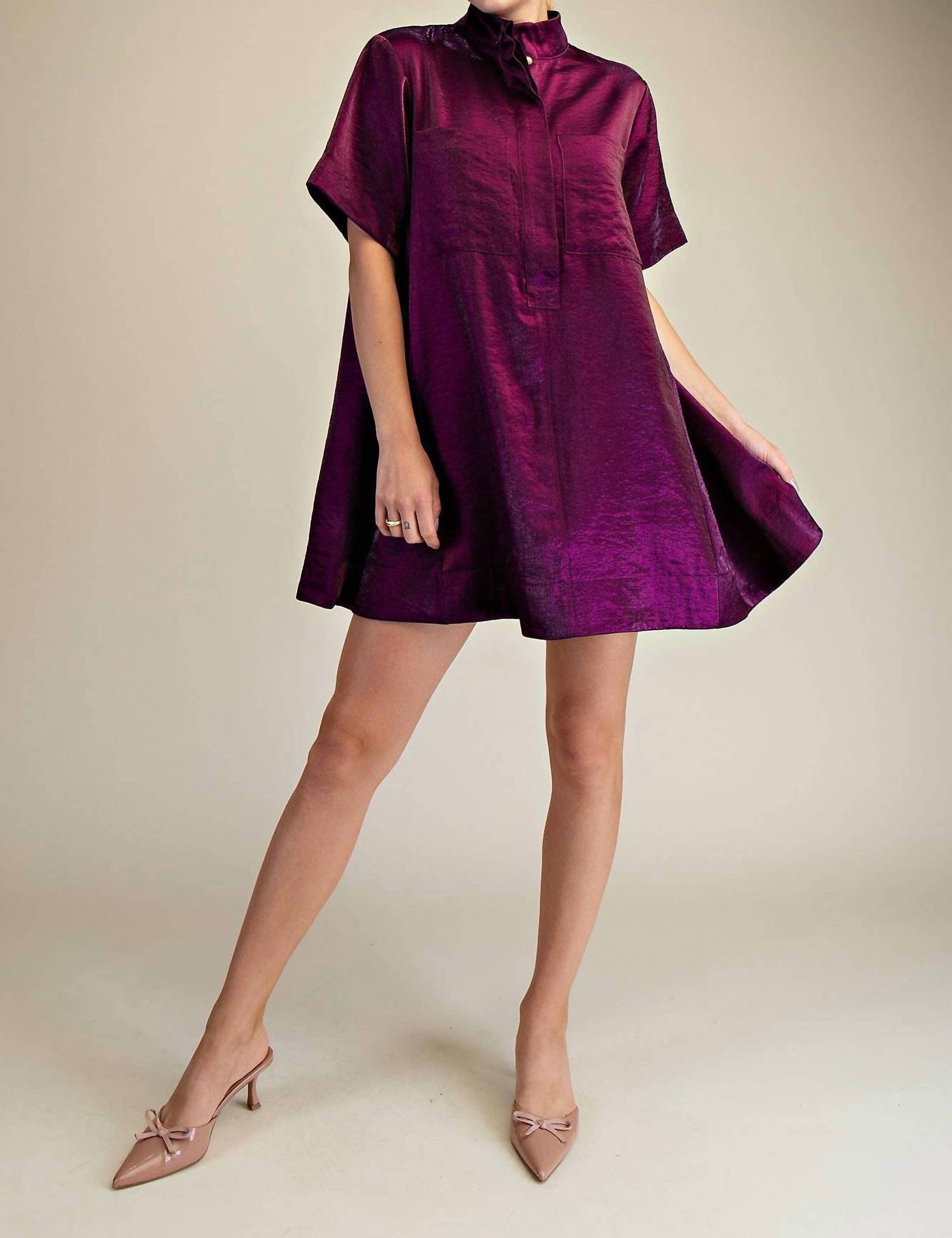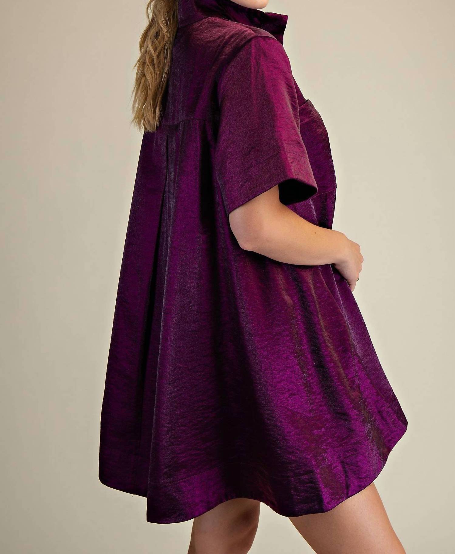 The kind of easy and flattering dress you'll be reaching for all season long. Introducing the Button Front Short Sleeve Mini Dress by GLAM, an elegant choice for evening events in rich plum. This solid shift dress features short sleeves and a stylish collar neckline, adding a touch of sophistication. Made perfect for the spring season, this dress includes practical pockets and a convenient button closure. Care for this dress with dry cleaning to maintain its quiet luxury charm. Model is 5'8" and wearing a size small.