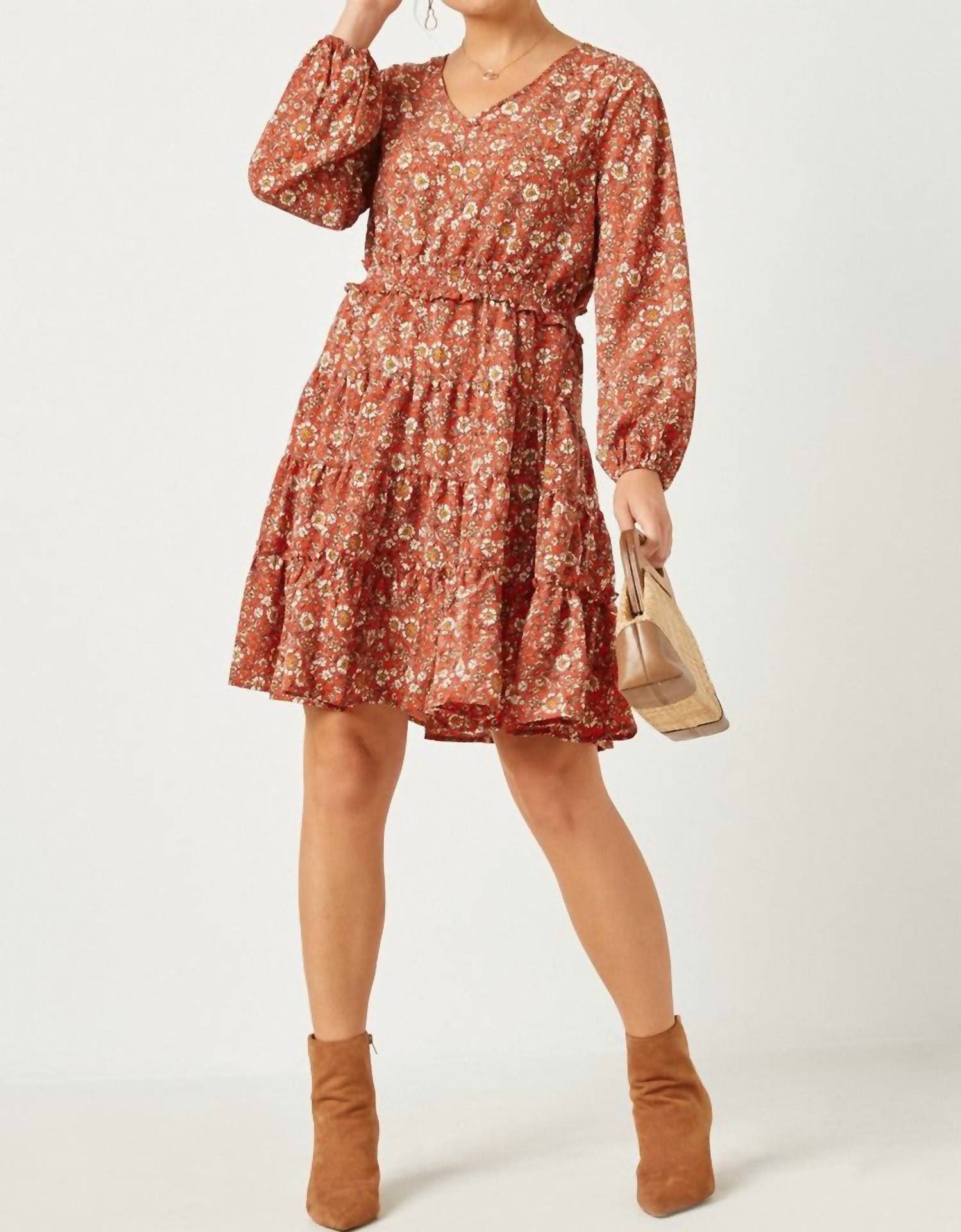 The perfect mini dress for those warmer months. Elevate your wardrobe with the Smocked Waist Ruffle Tiered V-Neck Dress by Hayden LA, designed in a captivating coral floral pattern. This women's mini dress features long sleeves and a flattering A-line silhouette with a tiered hemline for added flair. The pull-on style ensures ease of wear, with a smocked elastic waistline enhancing comfort and fit. Made from beautifully woven floral fabric, this dress is an ideal choice for both casual and dressy occasions.