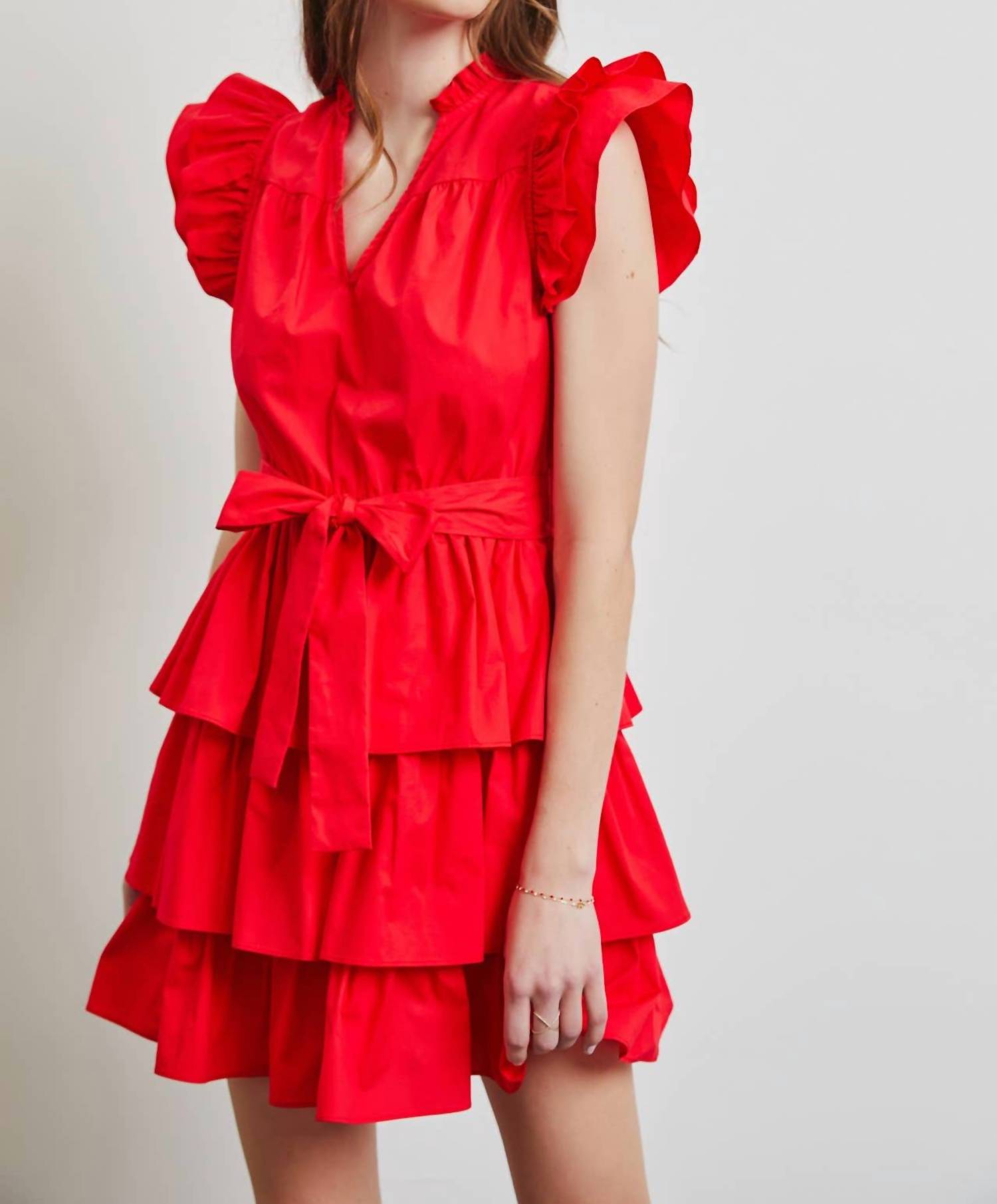 The kind of easy and flattering dress you'll be reaching for all season long. Step into spring with the Cherry On Top Poplin Ruffle Dress by Heyson, a captivating choice for any birthday or Valentine's Day celebration. Embracing a vibrant red hue, this mini, patterned dress features charming cap sleeves and a flattering A-line silhouette. Designed with a stylish V-neck and tiered ruffled skirt, it closes with a delicate tie closure. For optimal care, hand wash and lay flat to dry.