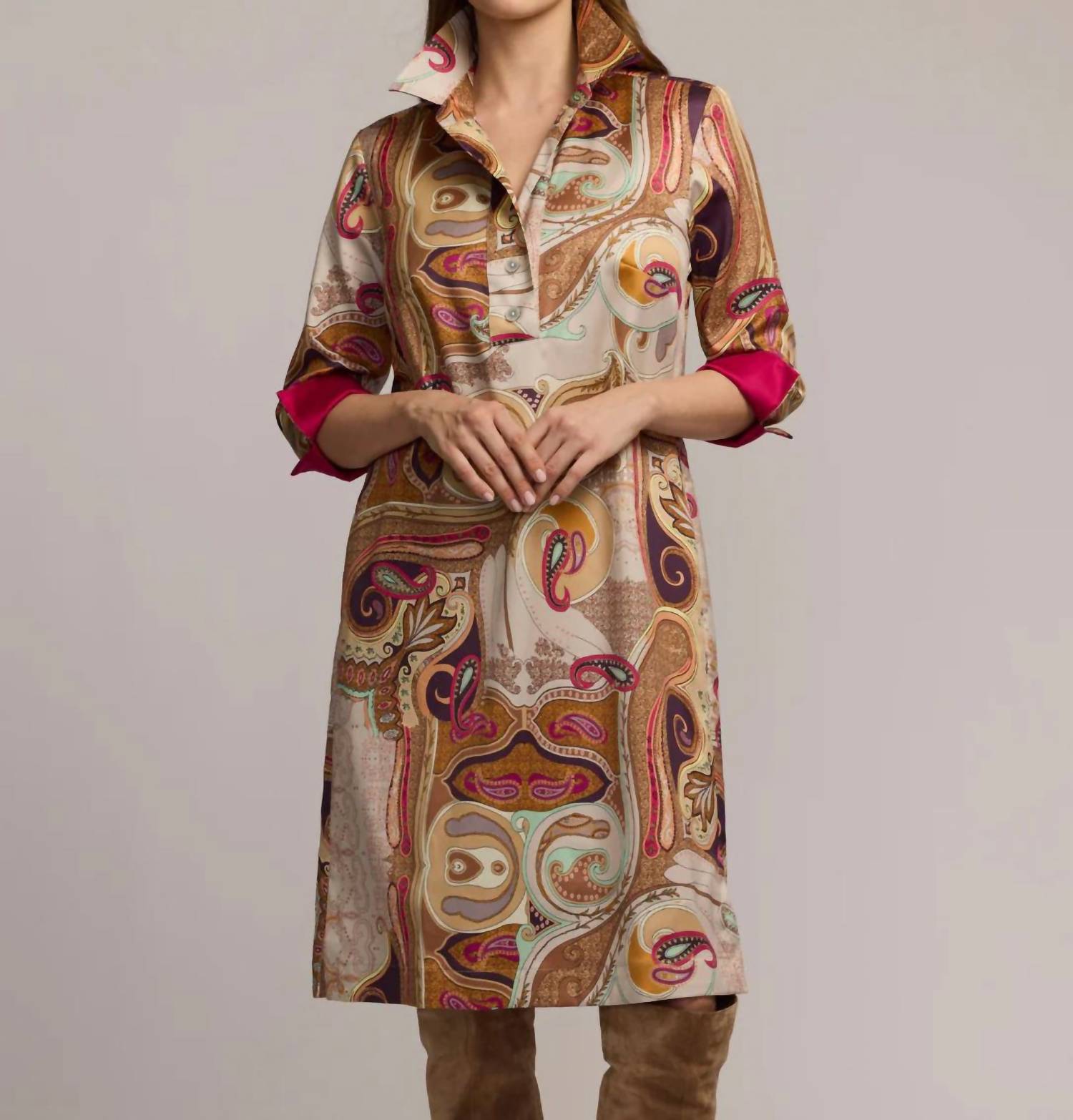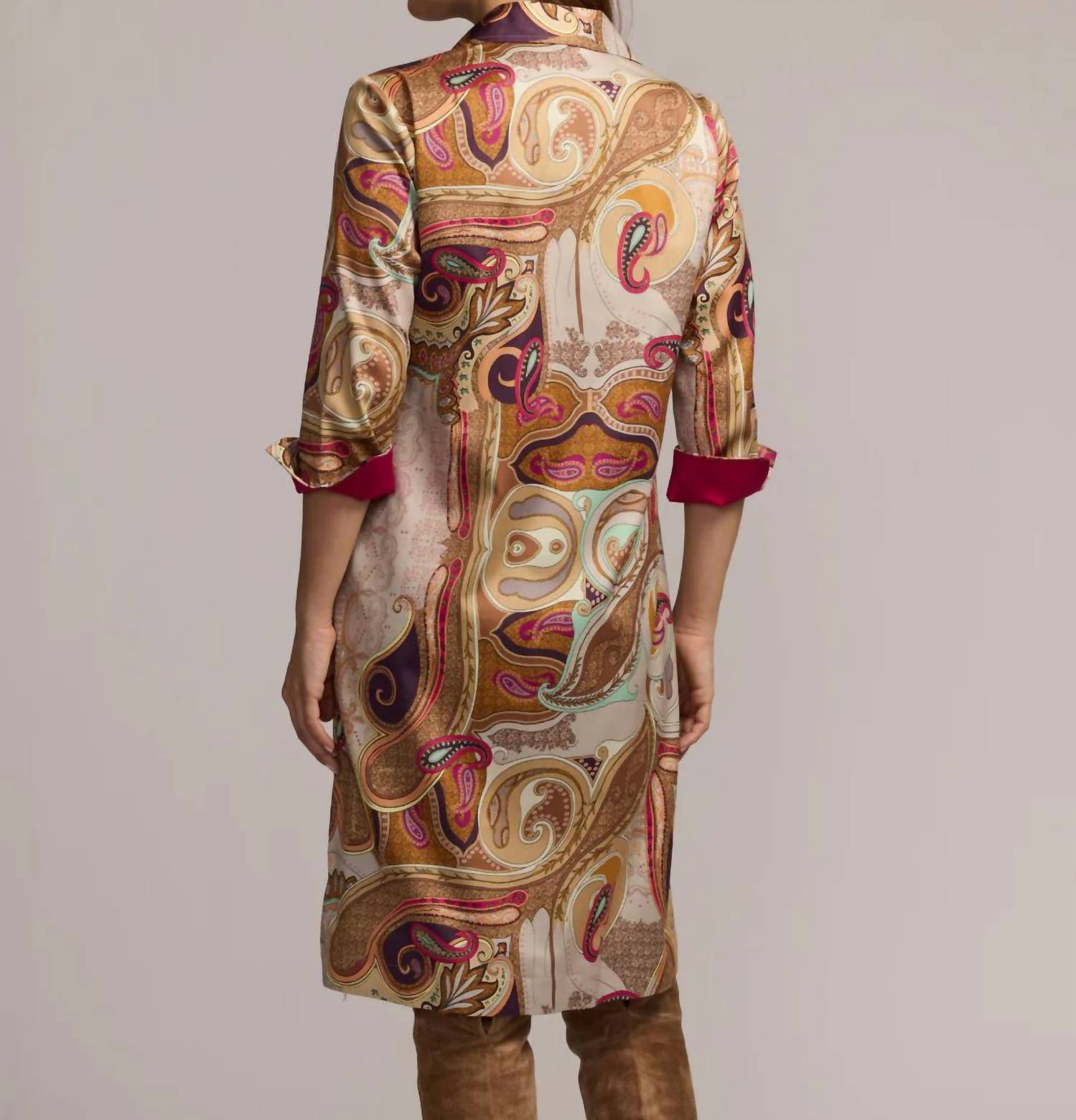 A short and breezy dress for those warmer days. Elevate your holiday party look with the Charlotte Three-quarter Sleeve Mini Dress by Hinson Wu, featuring a vibrant scarf print. Crafted from a luxurious cotton blend satin consisting of 70% Cotton and 30% Lyocell, this piece boasts a shirt collar with a split-v front placket and on-seam pockets for functionality. With a garment length of 39.5 inches for size Small and side slits of 7 inches, this dress is designed and made in Thailand. It comes with a convenient pull-on closure and is machine washable, requiring line drying for optimal care.
