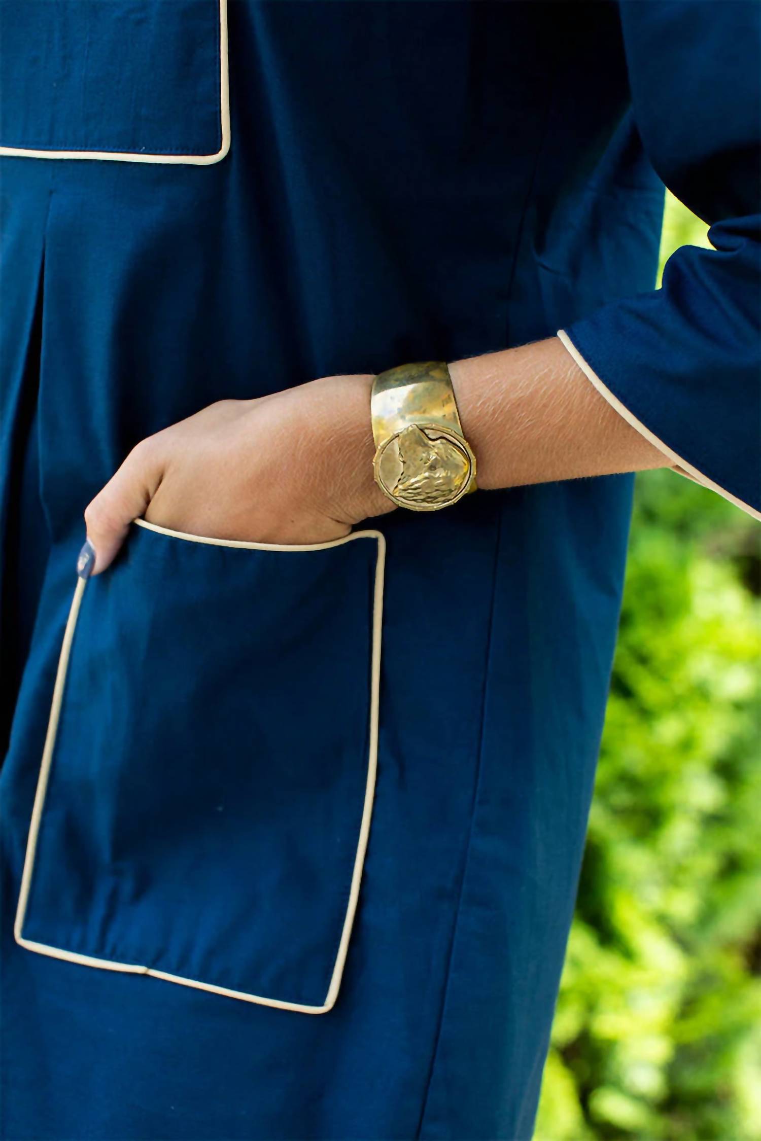 The perfect mini dress for those warmer months. Introducing the Cassidy Short Dress by House of MBR, a chic vacation-ready piece in a striking Navy & Camel geometric pattern. This mini dress features three-quarter sleeves and an oversized butterfly collar for a touch of elegance. Expertly crafted in Los Angeles, it is made from a breathable cotton blend consisting of 97% cotton poplin and 3% spandex, ensuring comfort and style. With convenient front patch pockets and a pull-on closure, its easy-care design includes hand wash instructions for lasting wear.