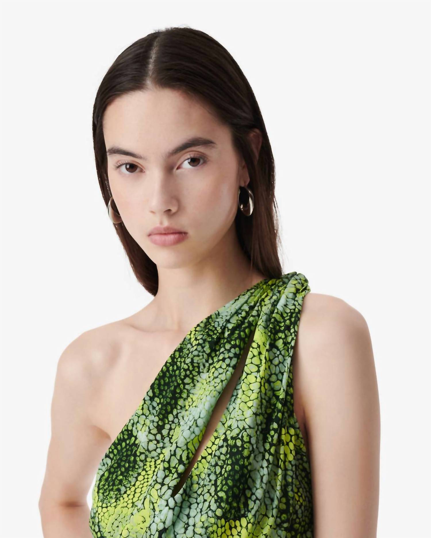 A short and breezy dress for those warmer days. Introducing the Inassa Dress by IRO, a striking mini dress in Green Multi, perfect for warmer months. This women's mini features a stylish one-shoulder asymmetrical cut with twist detailing and ruffles, enhancing its fitted A-line silhouette. Composition: 100% Viscose. Closure: Concealed side zipper.