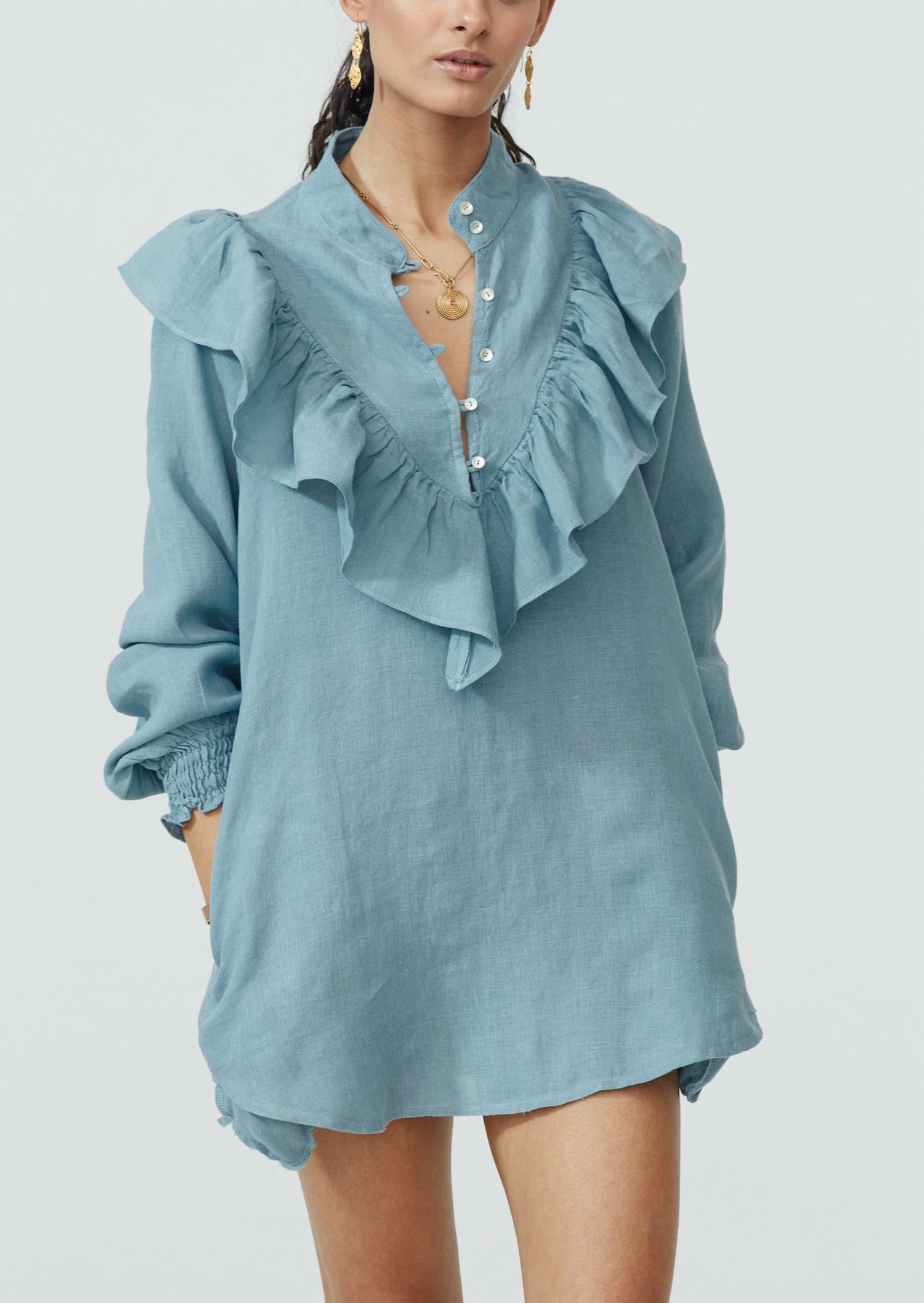 The perfect mini dress for those warmer months. Introducing the Circus Dress by Lanhtropy, a perfect choice for daytime events or special occasions. This romantic denim dress features draping long sleeves and a unique silhouette with a flattering neckline that opens with buttons. Made from 100% linen, this mini dress offers a boxy fit, accentuated by its slightly longer hemline in the back. Care instructions recommend hand washing cold and laying flat to dry.