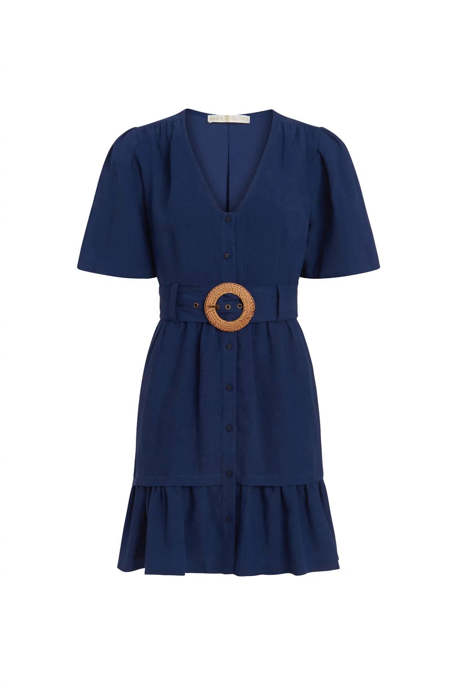 The kind of easy and flattering dress you'll be reaching for all season long. Introducing the Gwyneth Mini Dress by Marie Oliver, an essential piece for your summer wardrobe. This charming navy A-line dress in the color Pacific boasts short sleeves with statement bagged details and a sophisticated rattan-wrapped belt. Crafted from a 55% linen and 45% cotton blend, it is adorned with a button closure for easy wear. Care for it by machine washing on a gentle cycle with like colors and line drying or opting for dry cleaning. Perfect for any occasion, from brunch to a romantic date night.