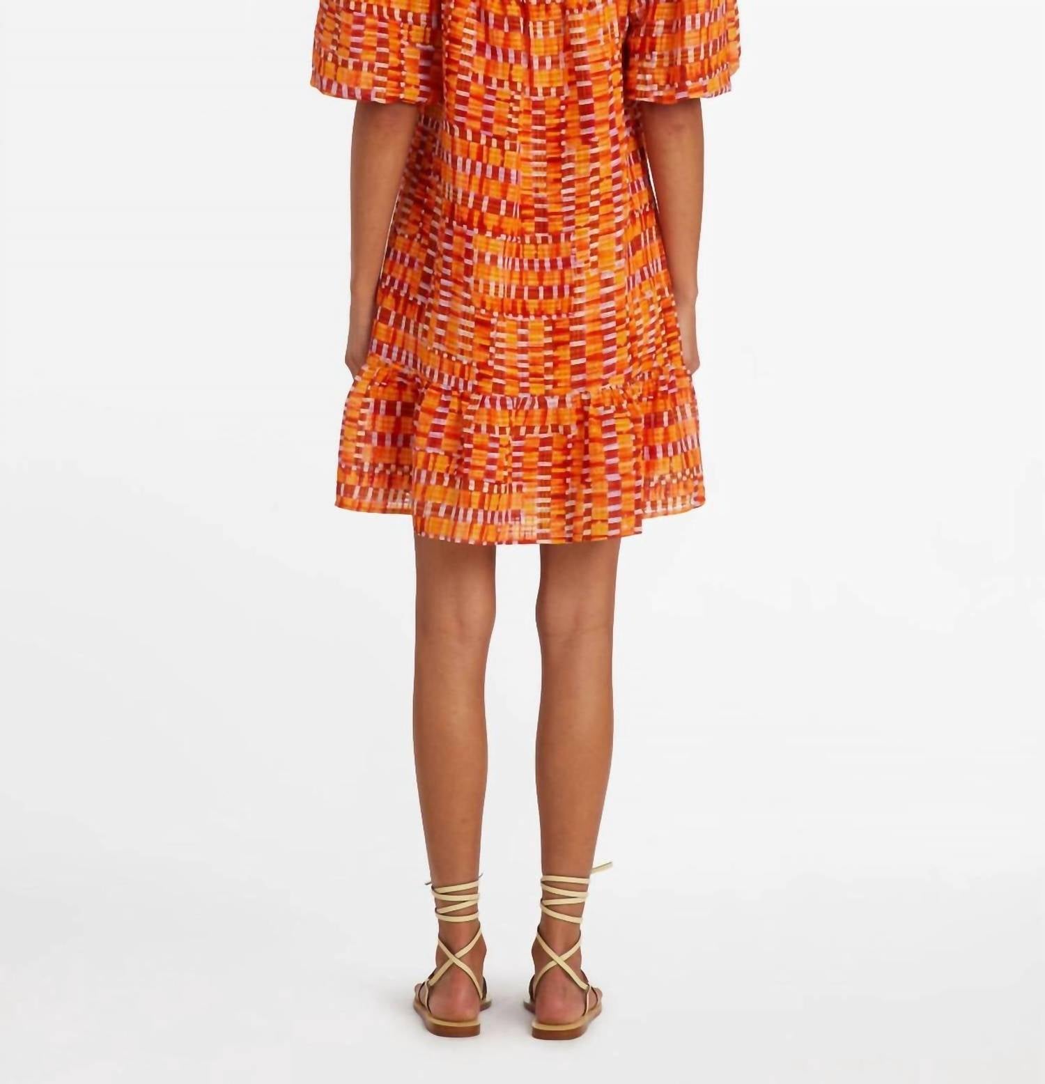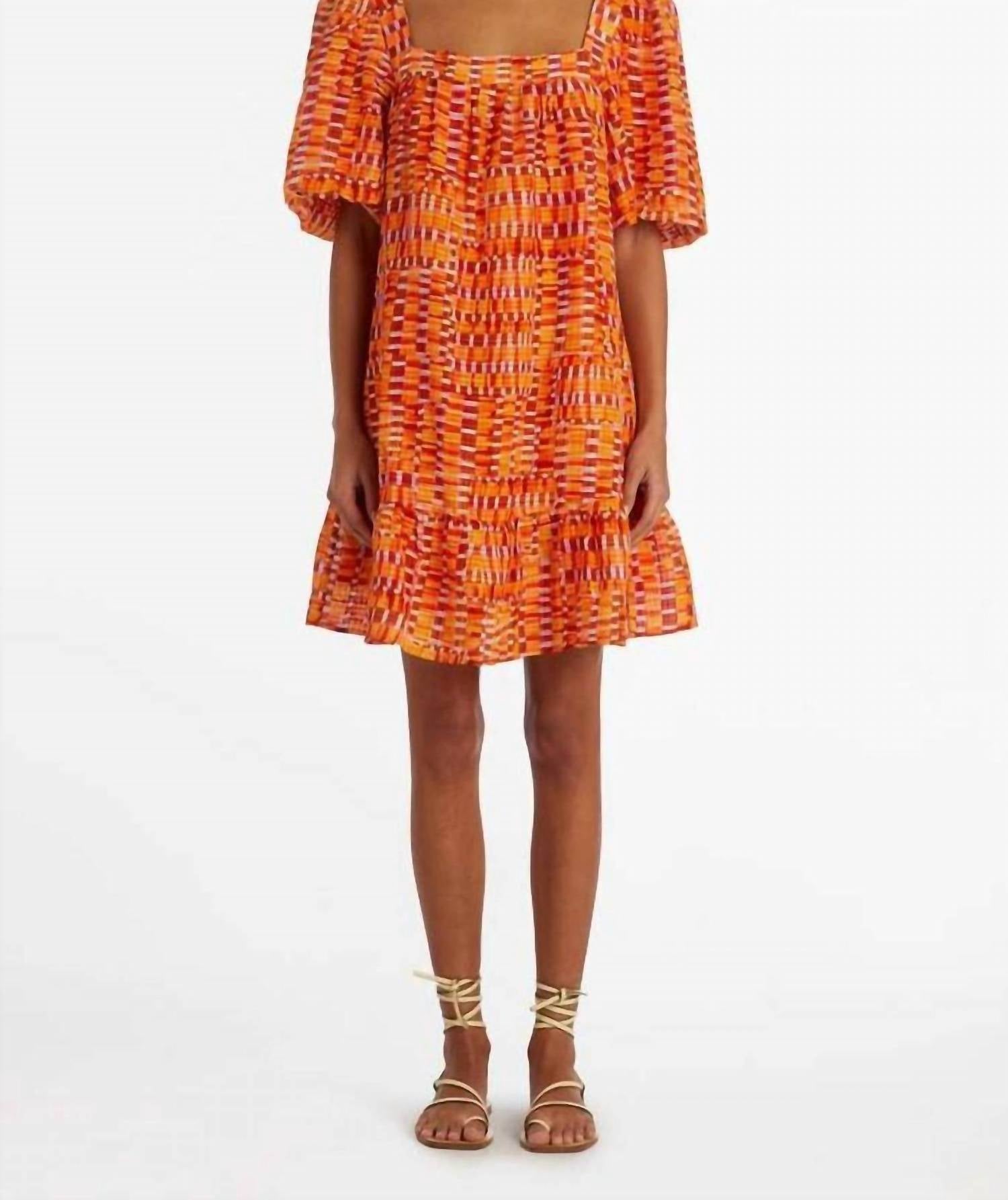 A short and breezy dress for those warmer days. Elevate your warm-weather wardrobe with the Kaylee Drop Waist Dress from Marie Oliver in the vibrant Clementine Check pattern. This mini A-line dress features short sleeves and a trendy square neckline that beautifully enhances the décolletage. Crafted from a linen blend composed of 44% Linen and 56% Viscose, it offers comfort and style. With its slip-on closure, this fully lined piece is perfect for maximalist travel looks. Care for this dress by machine washing.