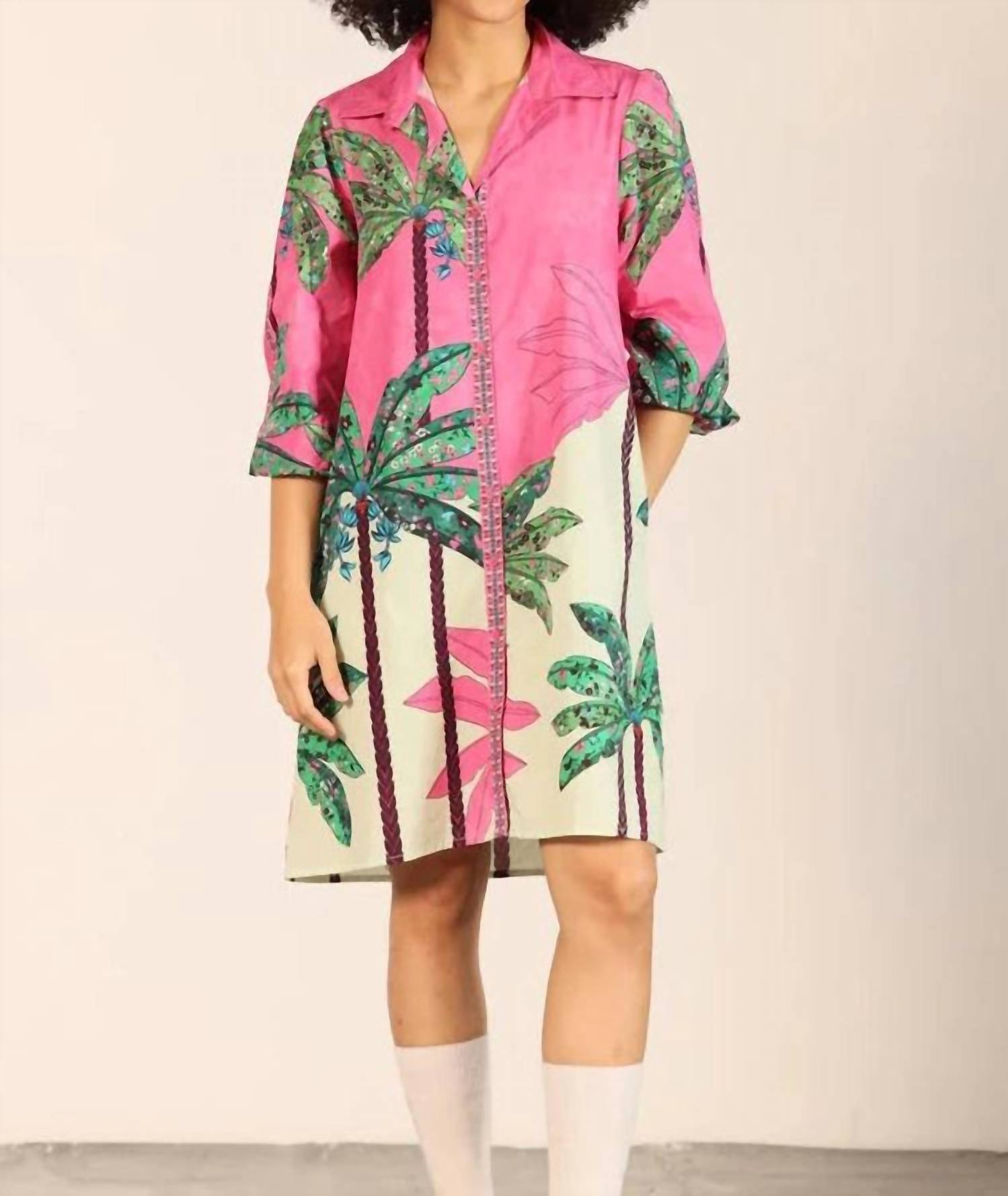 The perfect mini dress for those warmer months. Unveil your perfect summer style with the Ava Mini Dress by Maude Vivante, an embodiment of Boho Chic in a delightful Pink Tropics print. This shift silhouette dress features three-quarter sleeves with elastic cuff openings and a classic collar neckline, ensuring both style and comfort. Made from soft, breathable cotton, it hits above the knee and includes practical hip pockets. Closure: Button closure. Care Instructions: Machine wash. Ideal for vacation wear, this patterned mini dress effortlessly transitions from day outings to evening gatherings.