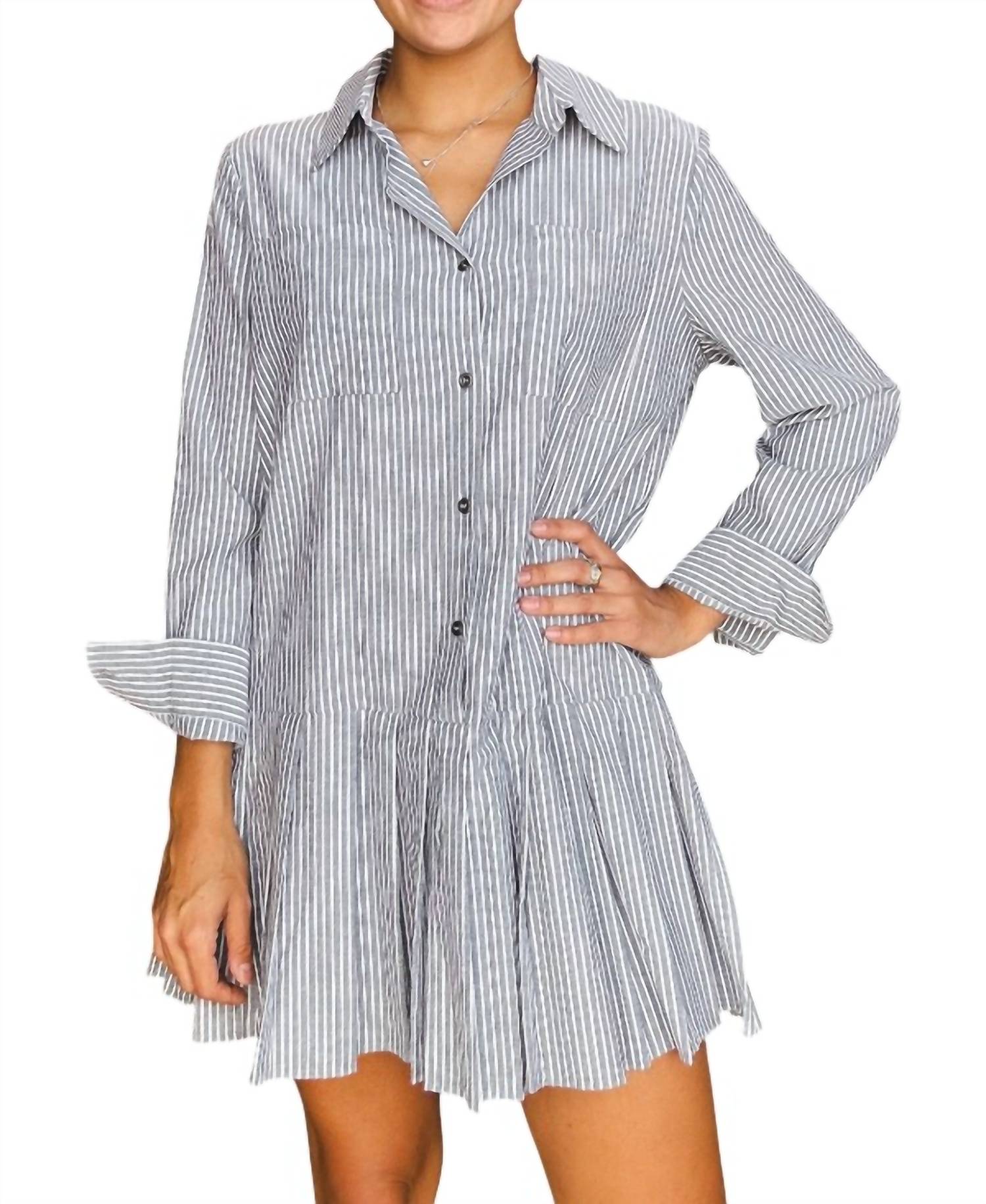 A short and breezy dress for those warmer days. Introducing the Stripe Shirt Dress by Meet Me in Santorini, offering a sleek minimalist appeal in a timeless gray stripe. This dress is a sleeveless design crafted from poplin cotton and falls at a flattering mini length, perfect for early fall or spring occasions. It features a tie at the center and a front button closure for easy wear, effortlessly combining style and comfort. Care is convenient with machine wash and tumble dry instructions, ensuring this becomes your go-to dress for various occasions. Cassie showcases a medium size fit, true to size.
