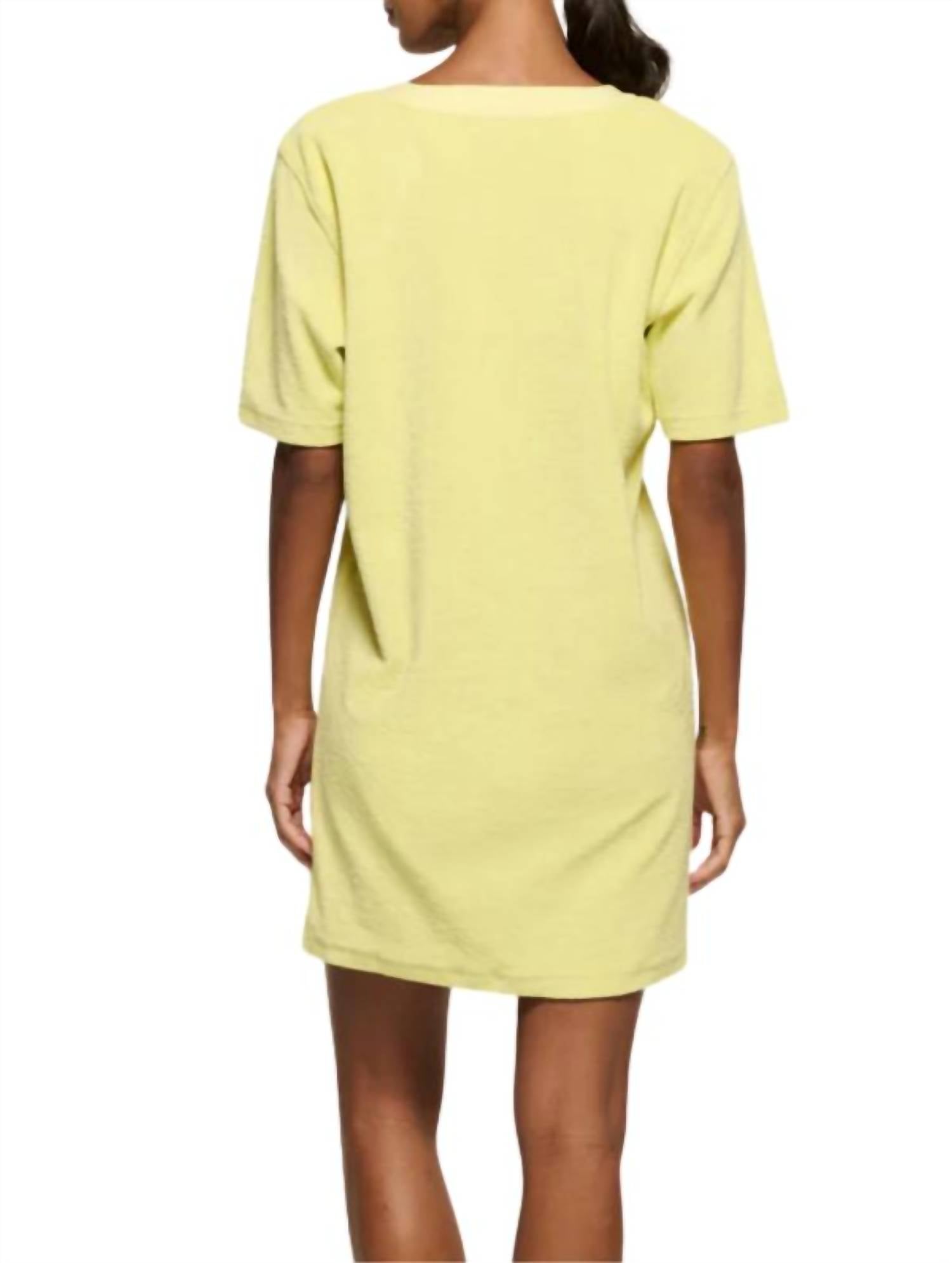 The perfect mini dress for those warmer months. Add a playful pop of color to your wardrobe with the Nation LTD Rio Mini Popover in vibrant Citrus Yellow. This women's shift dress features short sleeves and a charming v-neck tie neckline, enhancing its minimalist appeal. Made entirely from 100% cotton, it boasts a solid pattern with a convenient pull-on closure. Care is effortless with machine wash and tumble dry instructions, making it perfect for spring occasions like birthdays or Mother's Day.