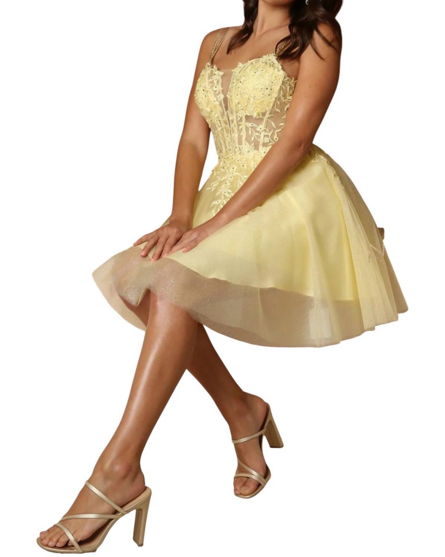 The kind of easy and flattering dress you'll be reaching for all season long. Discover the Embroidery Mini Gown With Straps by Nox Anabel, a sophisticated choice for your summer occasions. This sleeveless mini dress is crafted from luxurious chiffon featuring an A-line silhouette, adorned with a floral pattern and glitter accents. The design includes double straps with bead embellishments, supporting a mesh corset with a laced-up open back. Ideal for weddings, romantic dinners, and more, this dress embodies quiet luxury in a vibrant yellow hue.