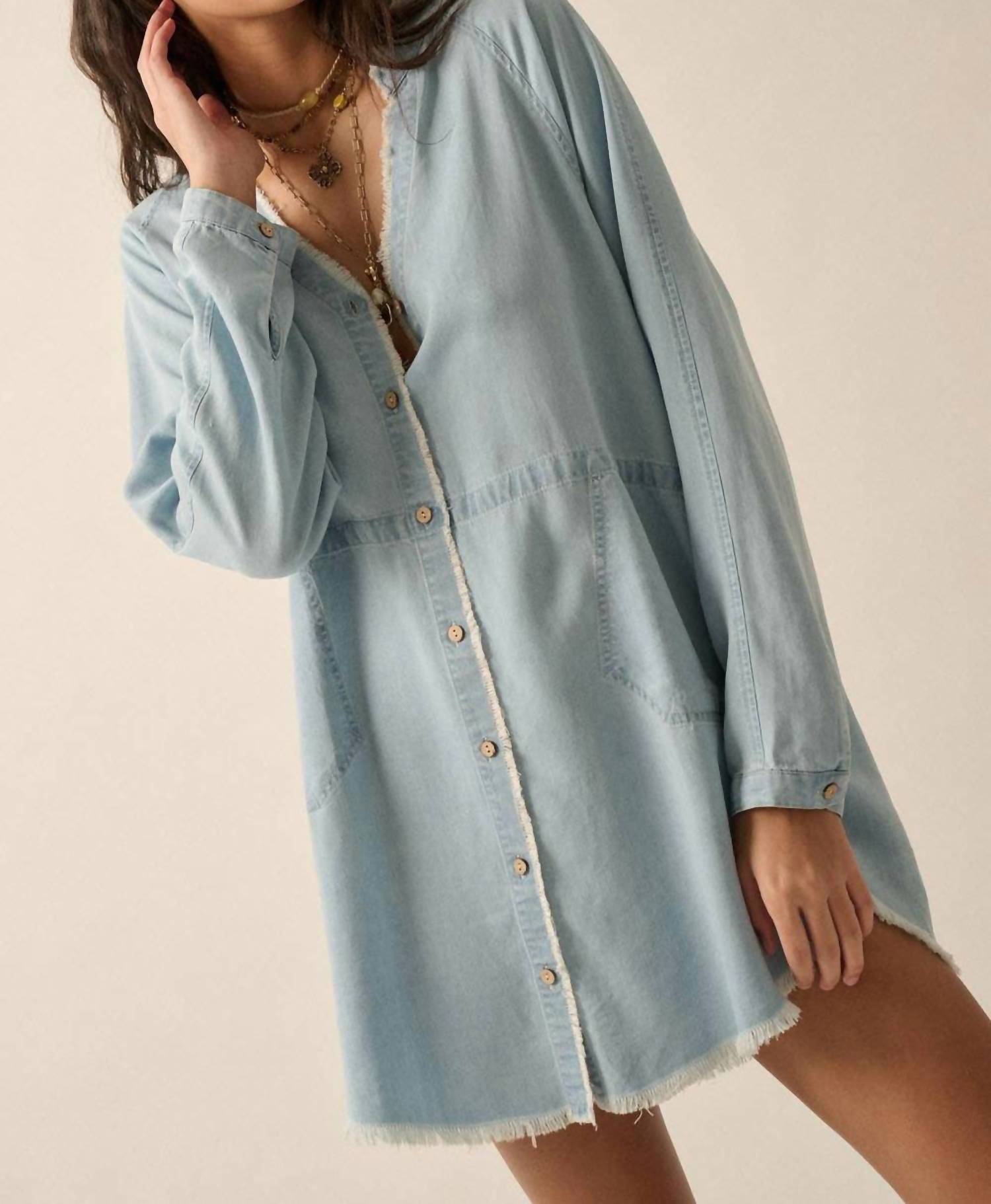 The perfect mini dress for those warmer months. The Whitney Denim Shirt Dress by PROMESA is a chic fusion of casual charm and western-inspired style, made from soft Lyocell in a light chambray hue. This mini dress features long sleeves, a relaxed fit, and a classic button closure, complete with roomy front patch pockets. The frayed hemline and raw edge detailing add rugged appeal to its versatile design. Care for this piece is easy with machine wash and tumble dry instructions.