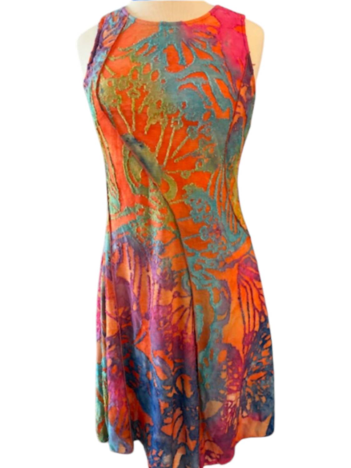 The kind of easy and flattering dress you'll be reaching for all season long. Perfect blend of color and comfort. Sheath mini dress features a vibrant orange multi-patterned print and a classic crewneck design, ideal for a boho chic spring look. Easy pull-on style. Hand wash only.