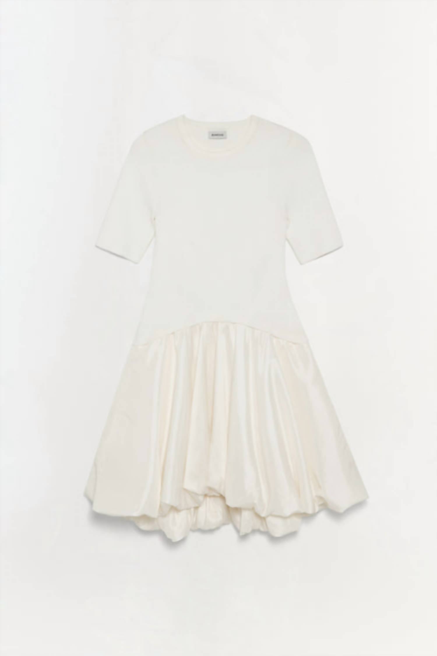 The kind of easy and flattering dress you'll be reaching for all season long. Elevate your holiday party wardrobe with the Kenny Combo Mini Dress from SIMKHAI, an exquisite choice in elegant ivory. This minimalist piece features short sleeves and is crafted from viscose with a captivating stretch-knit bodice adorned with tiny sequins, complemented by a voluminous gathered taffeta mini skirt. Enjoy the convenience of a pull-on design, perfect for any Thanksgiving celebration. Care for this dress is simple with hand washing recommended.