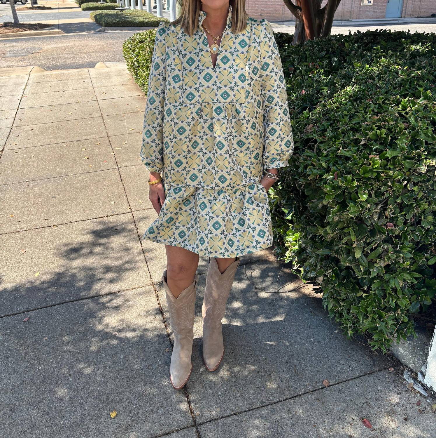 The perfect mini dress for those warmer months. The Claire Tile Jacquard Mini Dress by Sincerely Ours is a bold statement piece designed for maximalist flair. Featuring long sleeves and a chic tile-inspired pattern, this multicolored mini dress is crafted from structured jacquard fabric, ensuring both texture and visual appeal. Its fit-and-flare silhouette beautifully highlights your figure, while the pull-on closure adds convenience. Perfect for spring engagements or 4th of July celebrations, it's best kept in pristine condition with a gentle hand wash.