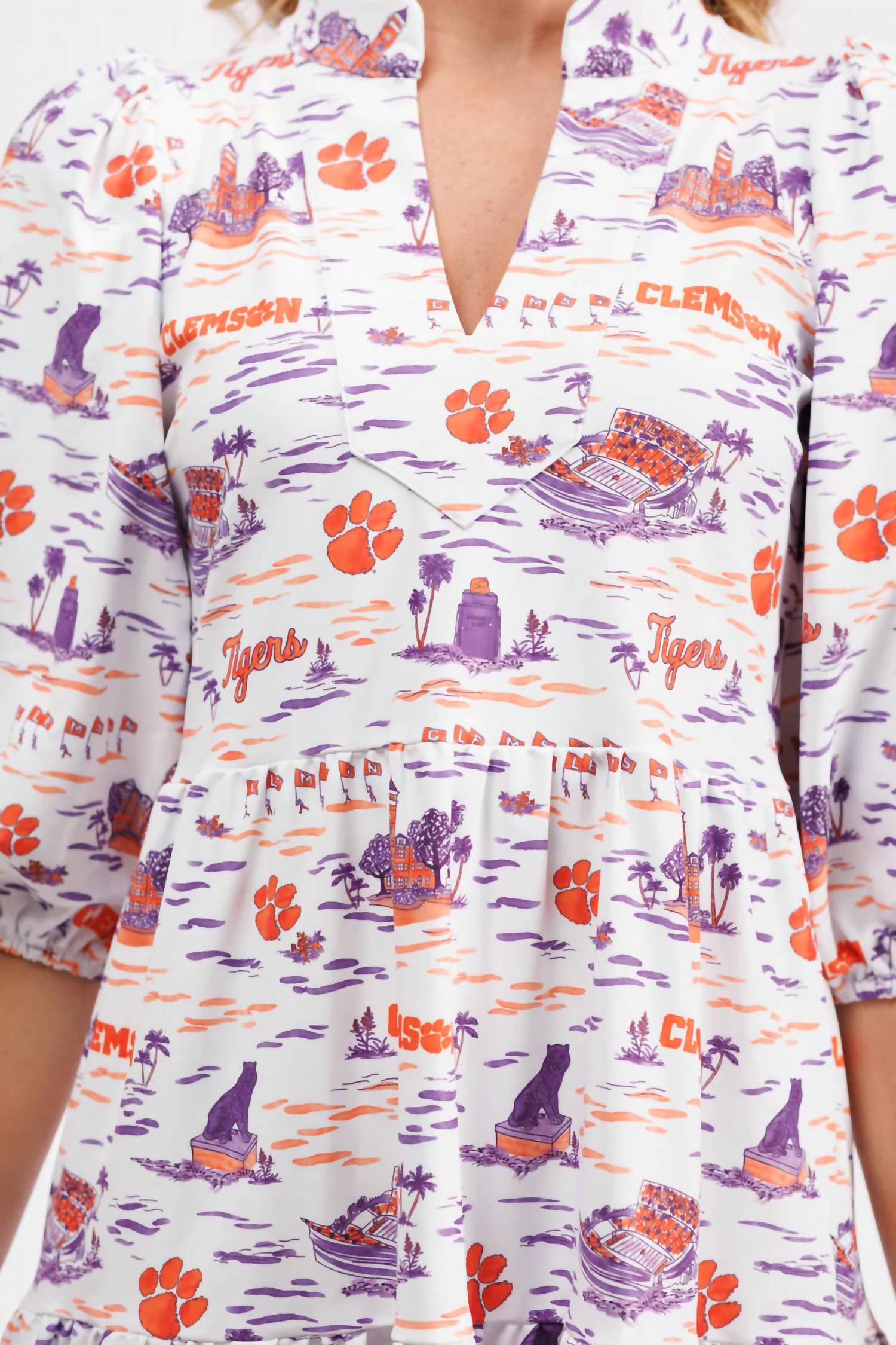 The perfect mini dress for those warmer months. The Tory Dress from SMITH & QUINN's Tailgate Collection adds playful elegance to your wardrobe in a striking Clemson Toile graphic. Featuring three-quarter length sleeves and crafted from S&Q Stretch fabric, this tiered tunic dress offers both style and comfort with its wrinkle-resistant properties. It measures 35.5 inches from shoulder to hem in size M, fitting for a spring holiday party. Easy maintenance is ensured with its machine washable fabric, making it a versatile addition to your spring collection.