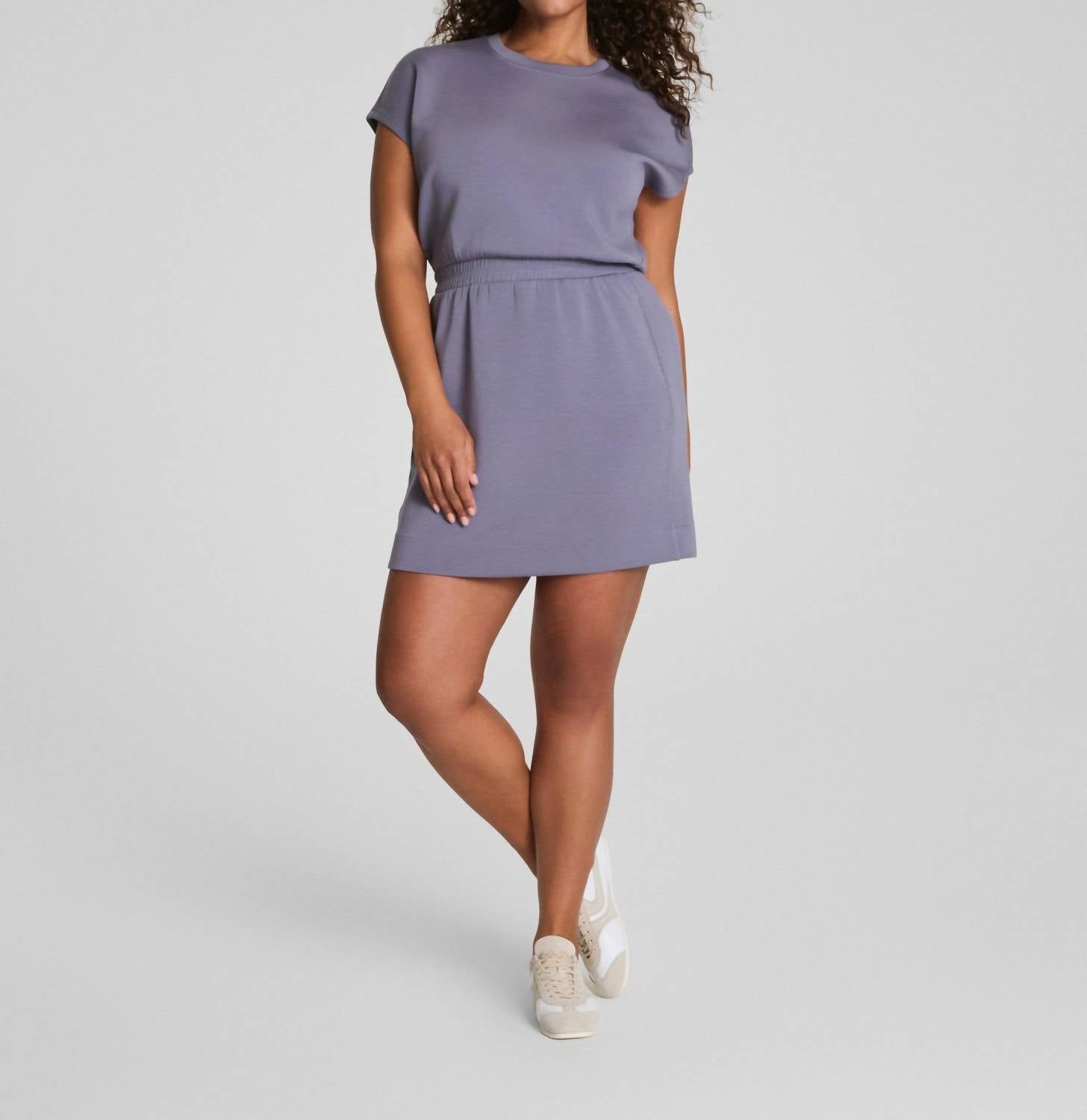 The perfect mini dress for those warmer months. Experience the perfect blend of comfort and style with the Spanx AirEssentials Crew Neck Sweatshirt Dress in Orchid Ash. Featuring short sleeves and crafted from a high-quality blend of 47% Tencel™ Modal, 46% Polyester, and 7% Elastane, this mini-length dress measures 36 inches in length. Designed for optimal air flow, the sheath silhouette includes a smocked waist and handy pockets, slipping overhead with ease. Ideal for spring, this vacation-ready piece is both chic and functional.