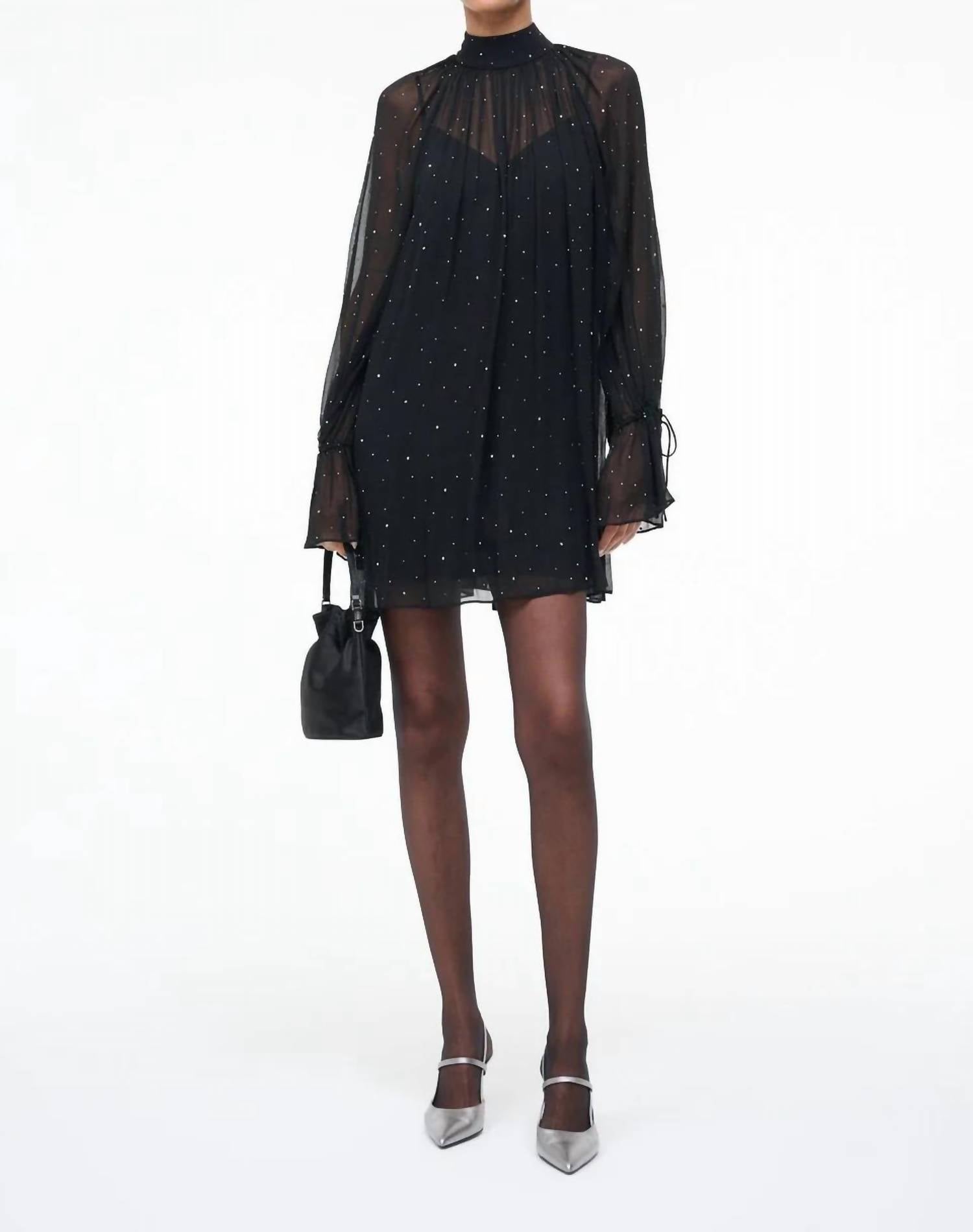 A short and breezy dress for those warmer days. Elevate your evening wear with the Roux Dress by STAUD, a striking piece perfect for dinner parties. Crafted from luxurious Viscose, this mini dress showcases a textured pattern and features elegant long poet sleeves. Design details include a stylish mockneck with a bow-tie tie closure at the back, adding an element of drama and sophistication. For care, please ensure dry cleaning only. Model is 5'10 and wearing a size S. 100% Viscose