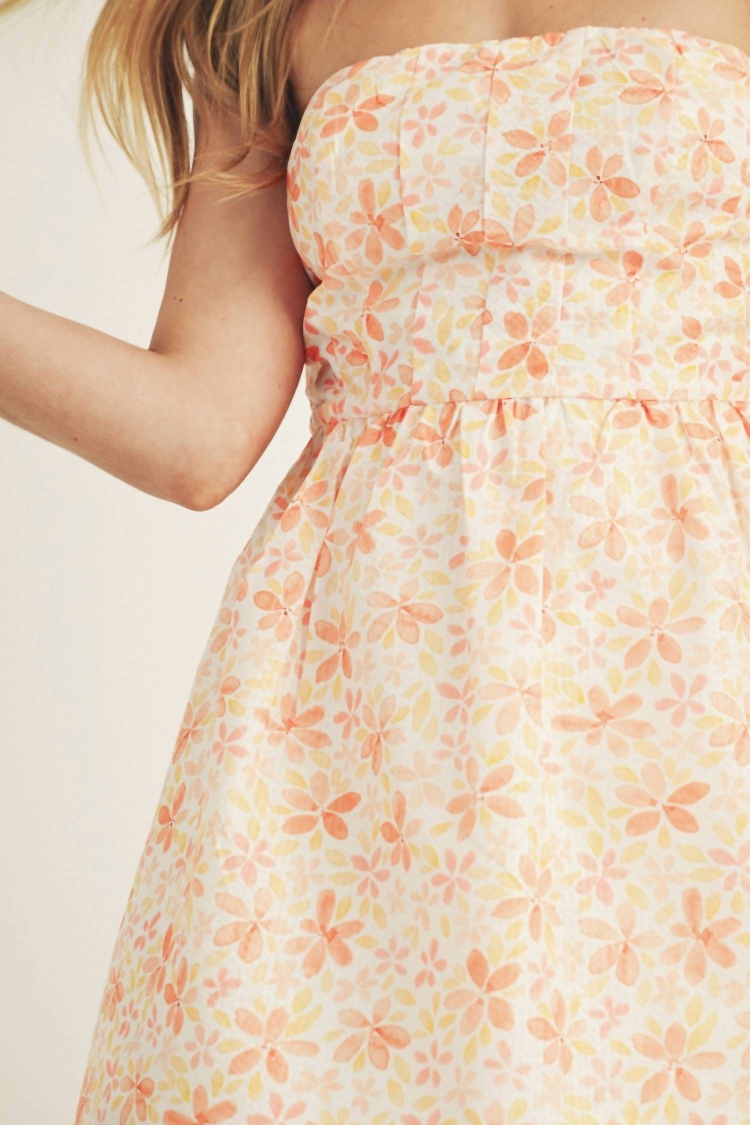The perfect mini dress for those warmer months. Introducing the Mary Mini Dress by STORIA, a vibrant choice for your spring wardrobe in multi-tonal orange floral. This strapless A-line mini dress showcases a pleated upper body with a gathered cinched natural waist, finished with a flared A-line silhouette. Made from 90% Polyester and 10% Spandex, this dress ensures comfort with an invisible zip closure. To maintain its boho chic appeal, hand wash and line dry as needed.
